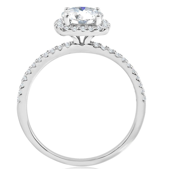 This 1 3/4Ct Moissanite & Diamond Cushion Halo Engagement Ring by Pompeii3 is classic and radiant. A 7mm round moissanite is surrounded by sparkling diamonds, all set in a high-polished white gold halo design.