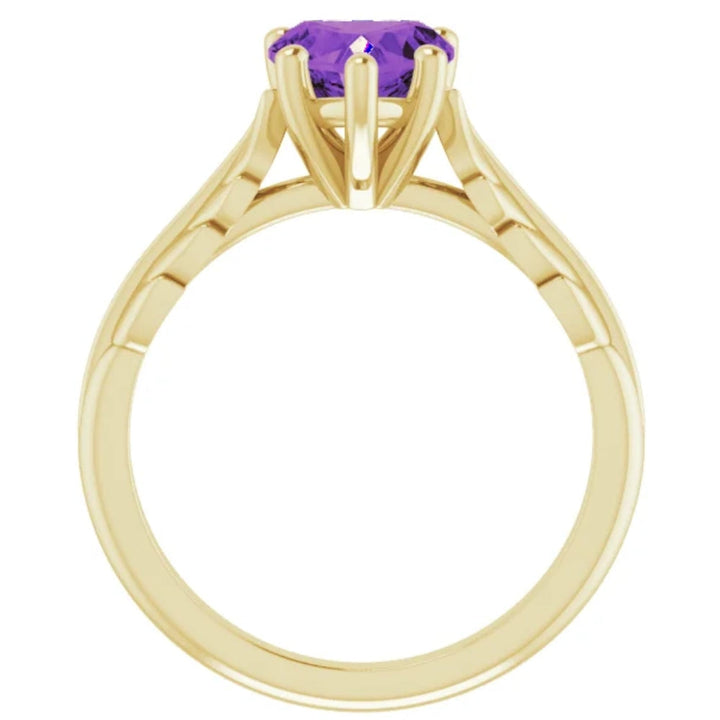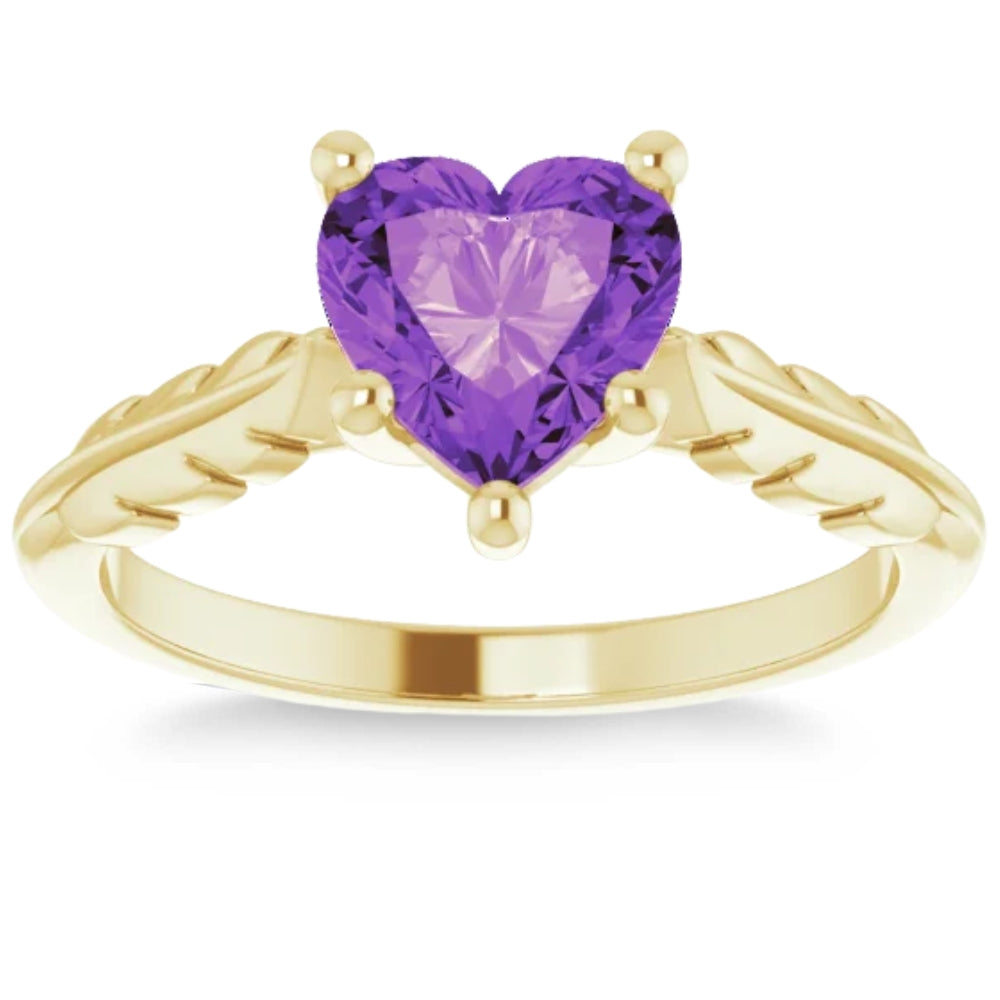 7mm Amethyst Solitaire Heart Shape Leaf Accent Ring in 14k White or Yellow Gold