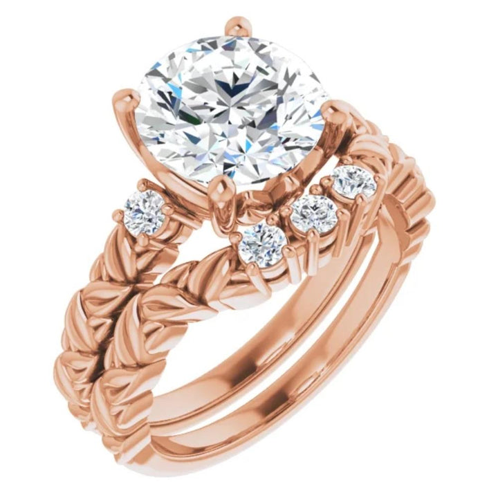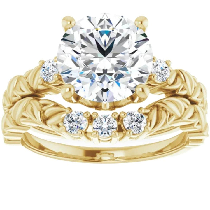 This 2 1/2Ct Diamond & Moissanite Petite Leaf Accent Engagement Set in 10k Gold by Pompeii3 features an 8mm round brilliant cut moissanite center stone, surrounded by five round brilliant cut diamonds. The band showcases an organic, petite leaf petal pattern, giving this engagement set a unique, nature-inspired design. The matching wedding band is included, making it the perfect choice for a romantic and meaningful celebration of love.