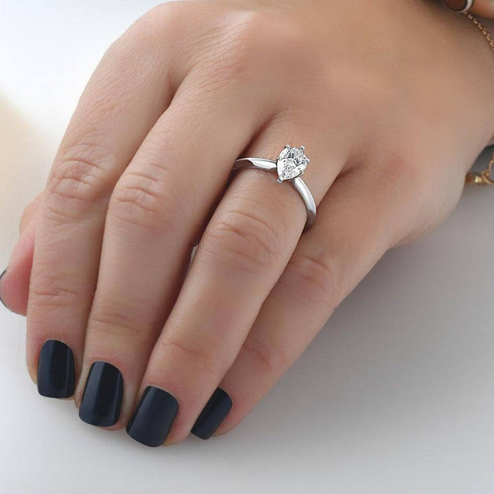 Set in solid 14k white, yellow, or rose gold with a 1ct pear-shaped moissanite in a six-prong solitaire mounting.