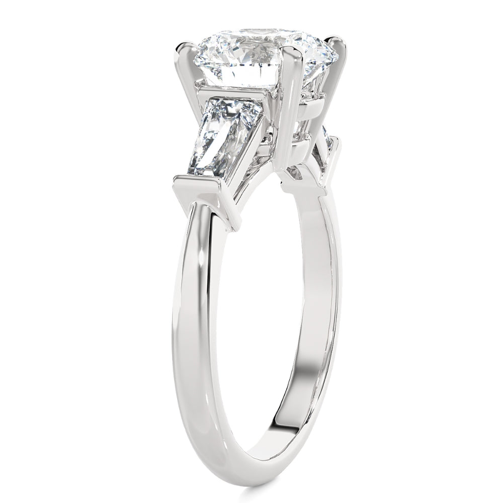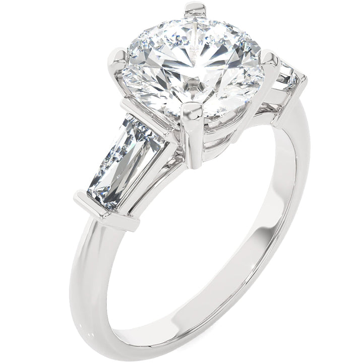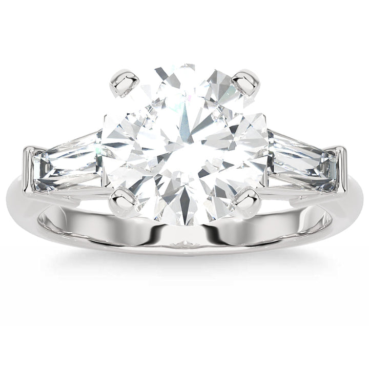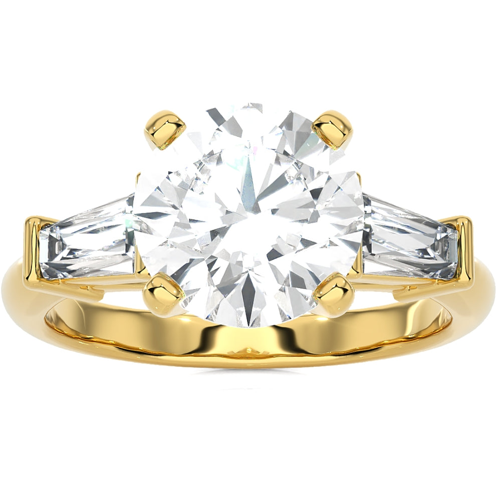 Set in solid 14k gold with a certified 2ct center stone and two tapered baguette diamonds totaling 2 5/8ct TW.