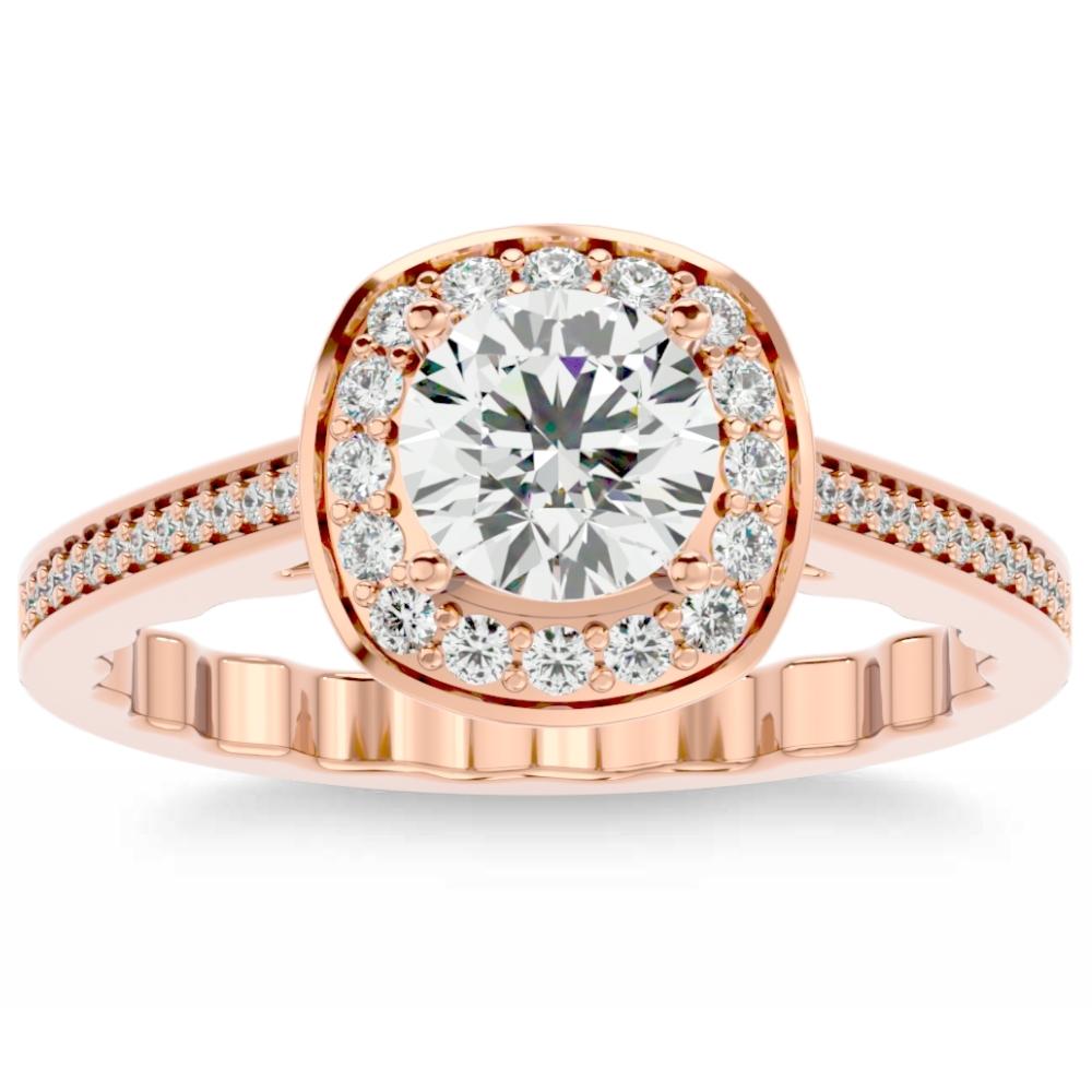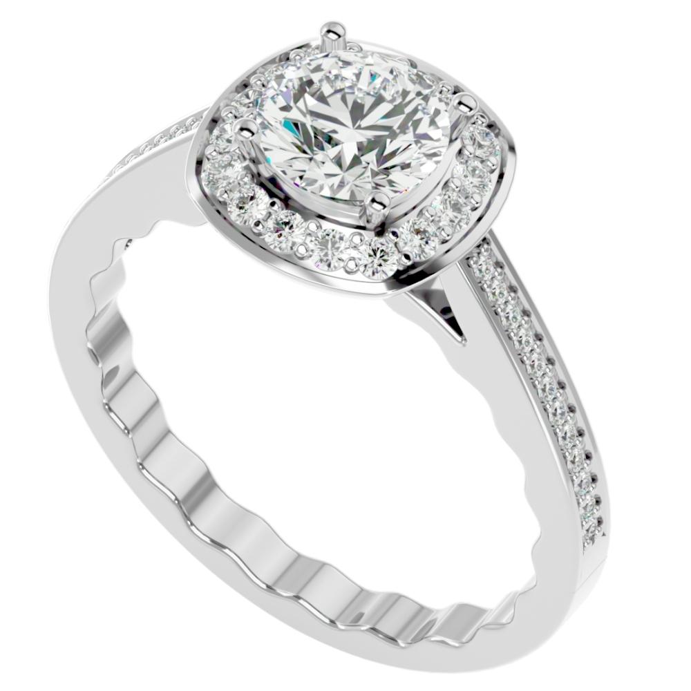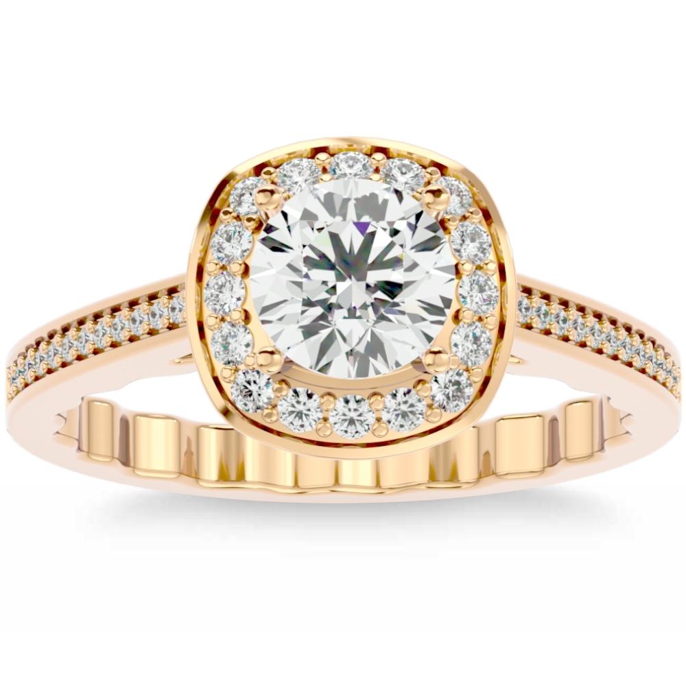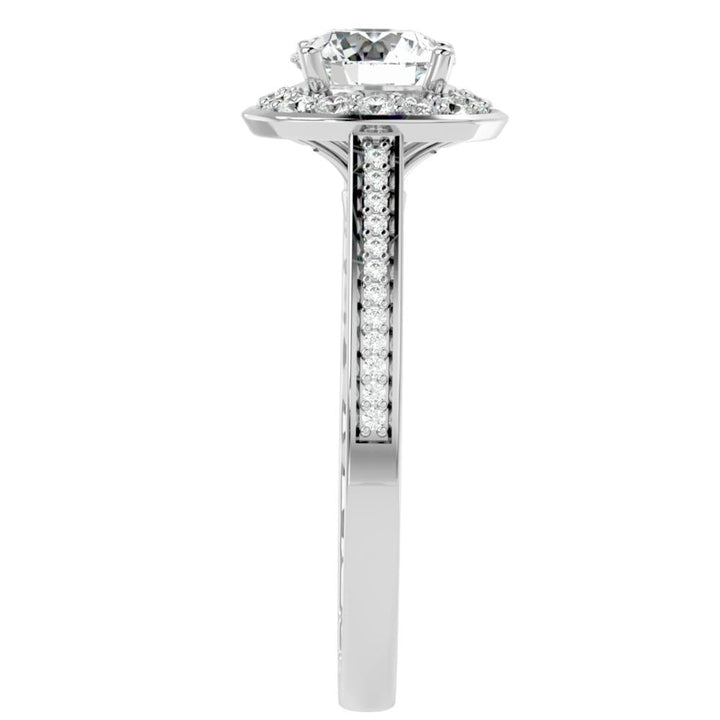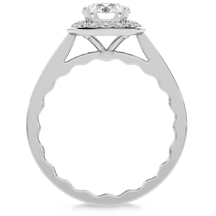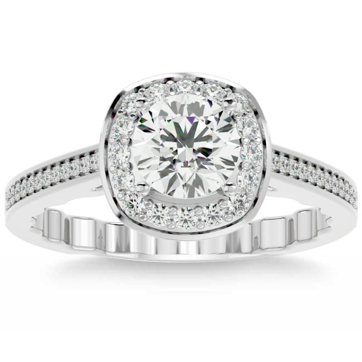 This 1 1/3Ct Cushion Halo Moissanite & Diamond Engagement Ring by Pompeii3 is both classic and modern. A 6mm round moissanite sits at the center, surrounded by 40 round diamonds in a delicate cushion halo setting that sparkles from every angle.