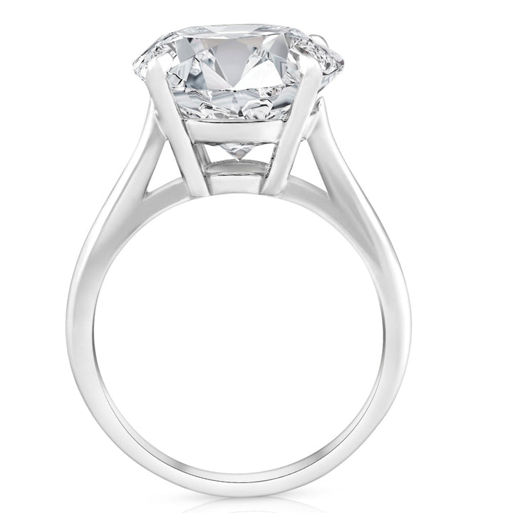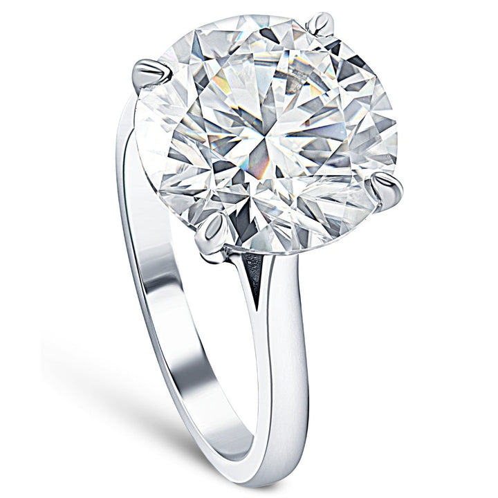 Features a 12mm round brilliant cut moissanite (6 ct) set in solid 10K white gold. The clarity of the moissanite is I1.