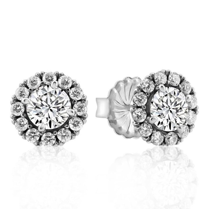 These 3 Ct Round Halo Diamond Studs by Pompeii3 are the perfect everyday earrings, featuring round brilliant-cut diamonds prong-set in solid 14k white gold. The enhanced 11.5mm halo design adds extra sparkle, making them ideal for any occasion, from casual outings to formal events.