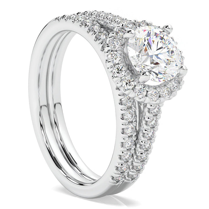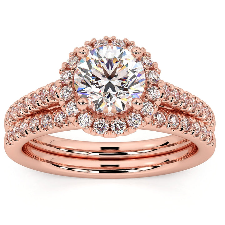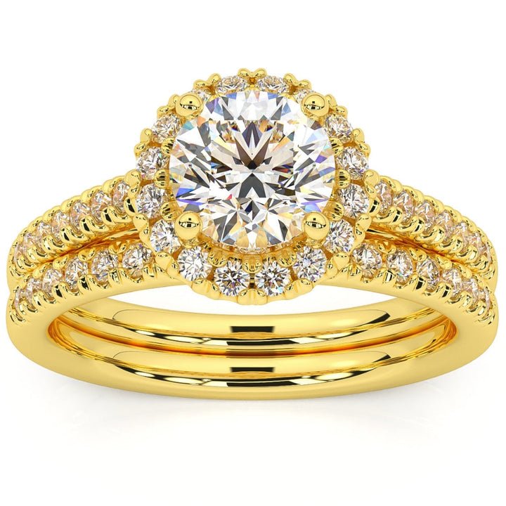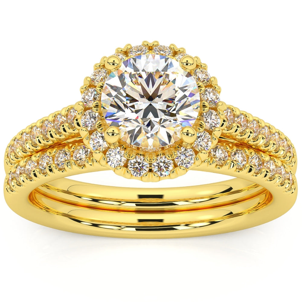 Crafted from solid 14K gold, featuring a 1ct center diamond and round brilliant-cut accent diamonds totaling 1.50ct. Prong set in a polished halo mounting. The set includes a matching wedding band.