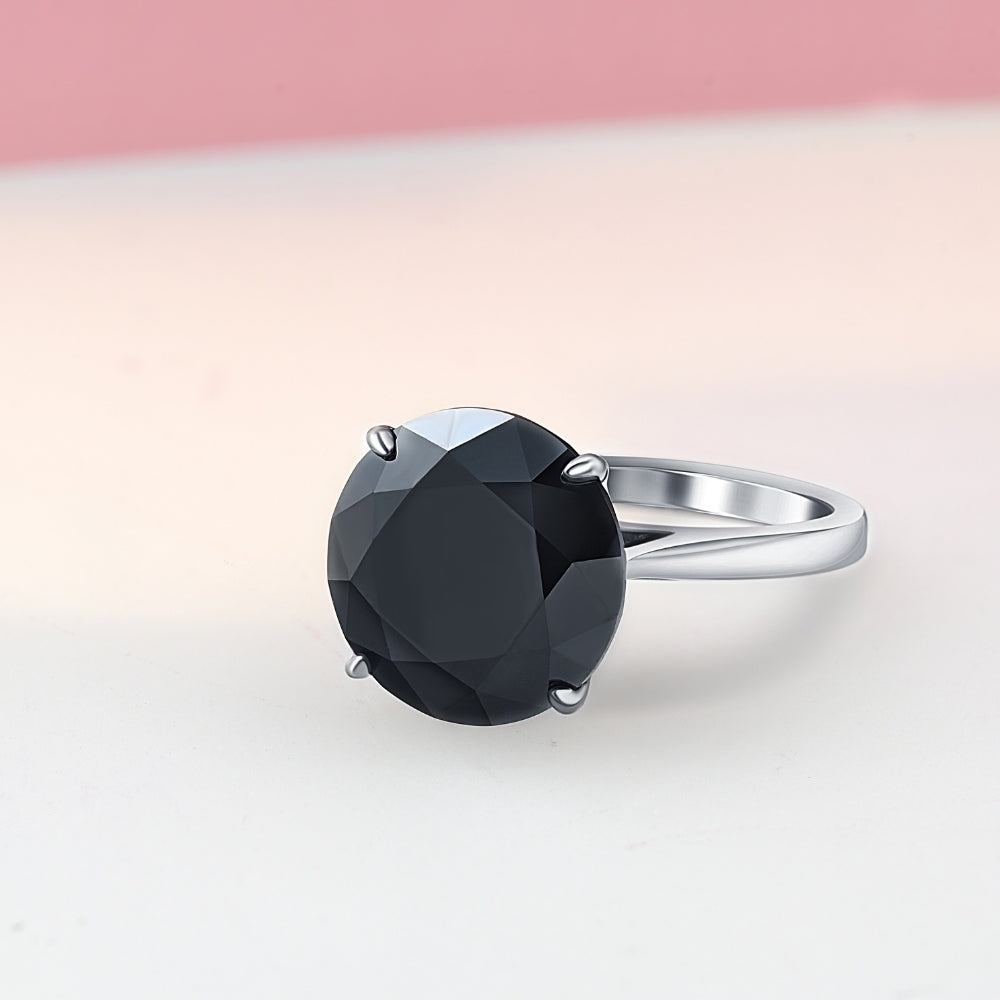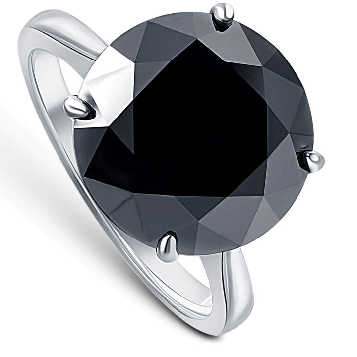 Solid 10k white gold with an 13mm round brilliant cut black moissanite. Four-prong setting in a high-polished solitaire mounting.