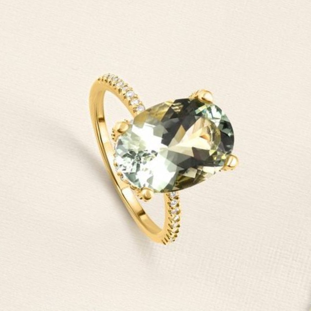 This 5 3/4Ct Oval Green Amethyst Diamond Side Halo Ring in 14k Yellow Gold Lab Grown by Pompeii3 features a 14x10mm oval-shaped green amethyst, flanked by 66 round brilliant-cut lab-grown diamonds. The stones are prong-set in a high-polished solid 14k yellow gold setting.