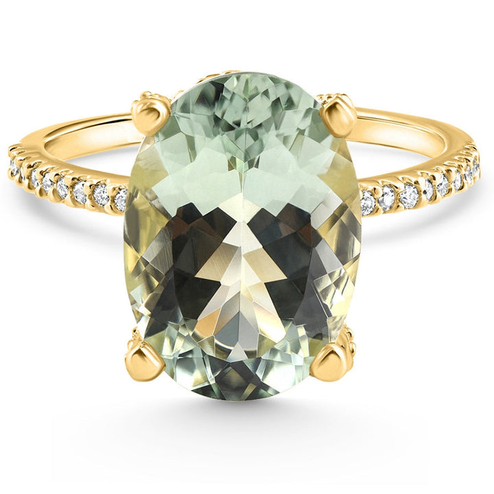 5 3/4 ct Oval Green Amethyst Diamond Side Halo Ring 14k Yellow Gold Lab Grown