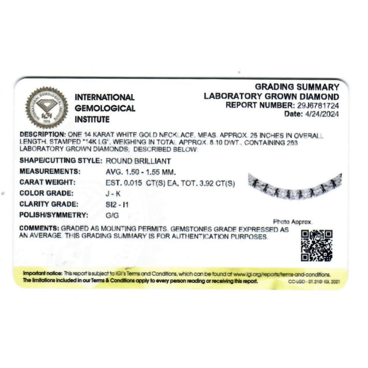 Set in solid 14k white gold with 3.92ct total weight lab-grown round brilliant-cut diamonds. Length: 25".