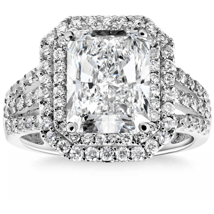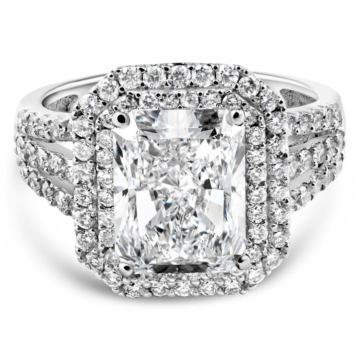 This Certified 4 1/2Ct Radiant Cut Diamond Engagement Ring by Pompeii3 is a bold statement of luxury. Featuring a certified 4ct radiant-cut diamond framed with round accent diamonds, this design speaks to opulence and enduring elegance.