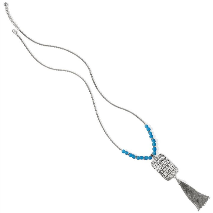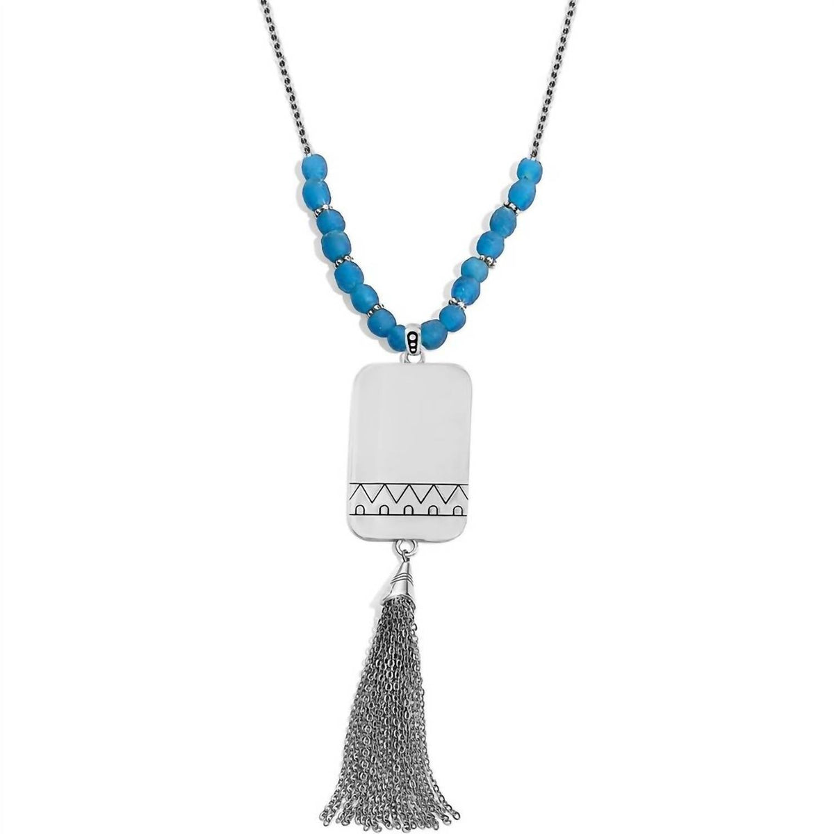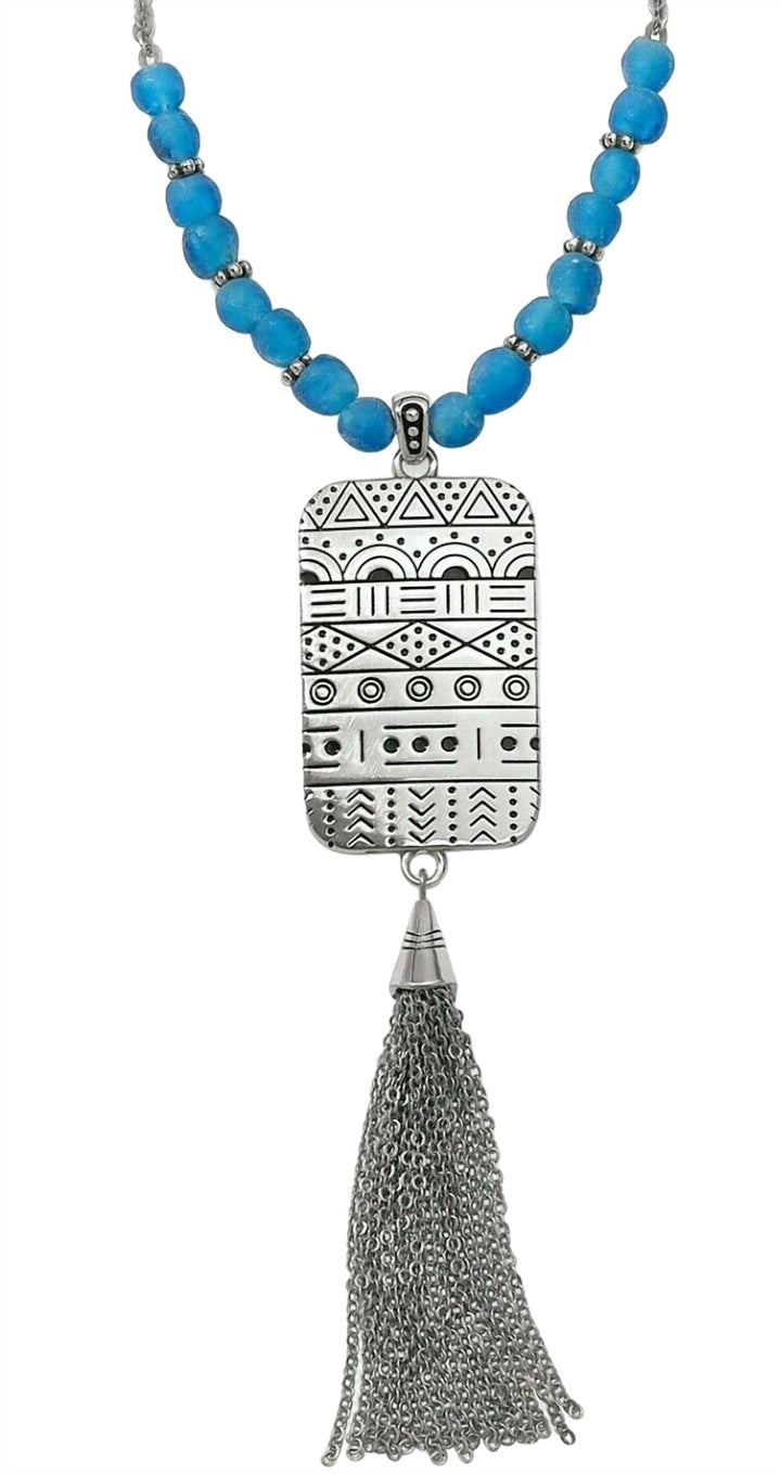 This Women's Africa Stories Etched Beaded Necklace in Blue by Brighton is a stunning and versatile piece. Inspired by the patterns and motifs of ancient African tribal designs, this silver-plated pendant tassel necklace adds a sense of adventure to any outfit. The adjustable length allows for customized wear, and the 5" pendant drop adds an eye-catching touch to your look. Wear it alone or layer it with other pieces for a bold statement.