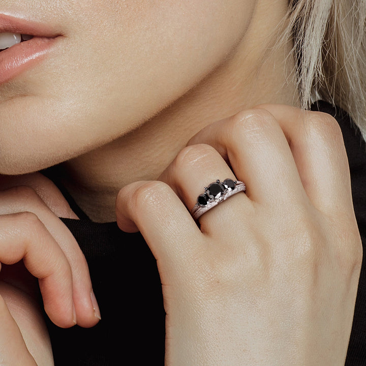 This 2ct TW Black and White 3-Stone Diamond Engagement Ring by Mimi & Max is bold and unforgettable. Featuring three round black diamonds flanked by delicate white diamond accents along a detailed ribbed band, this ring celebrates contrasts and elegance for a lifetime of commitment.