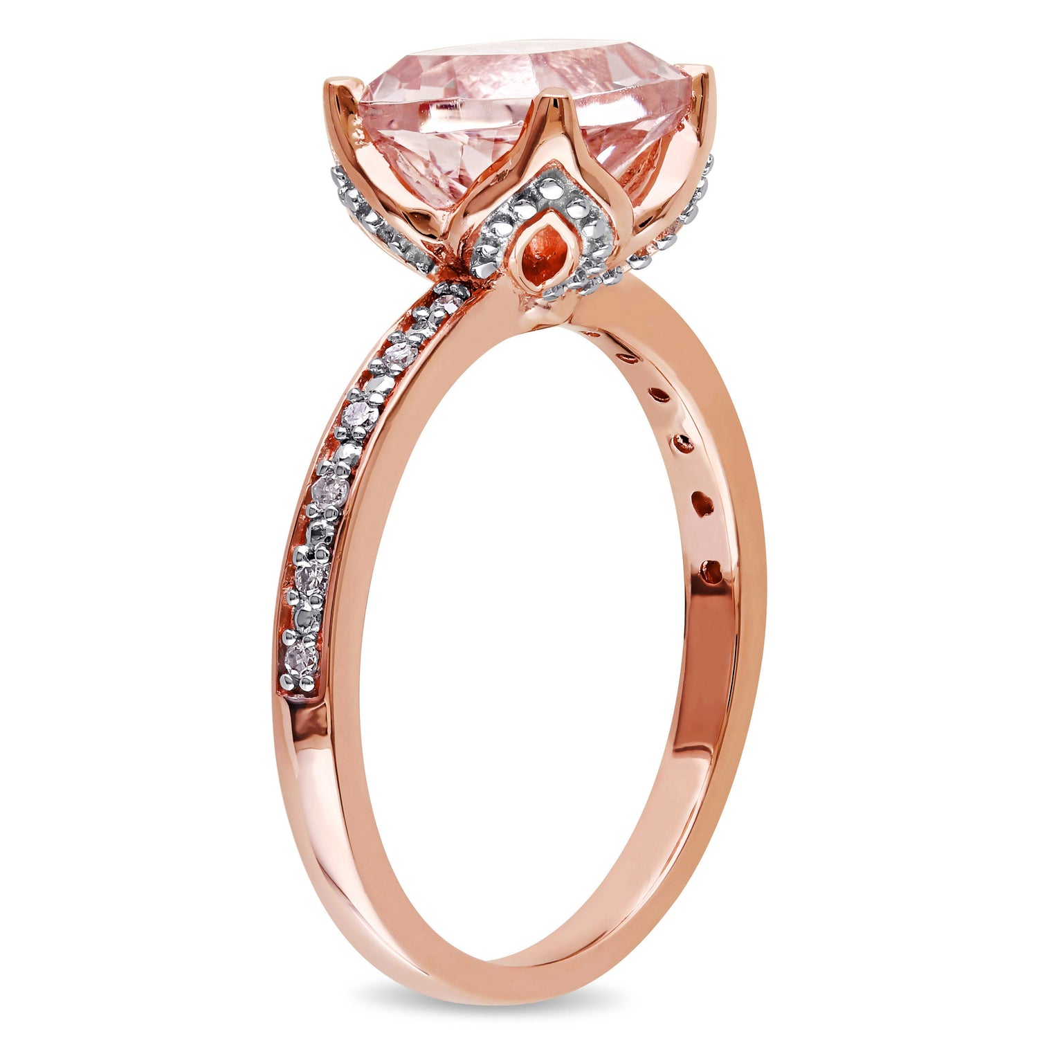 Crafted from 10k rose gold with a 2ct total gemstone weight of cushion-cut morganite and 12 round-cut diamonds.