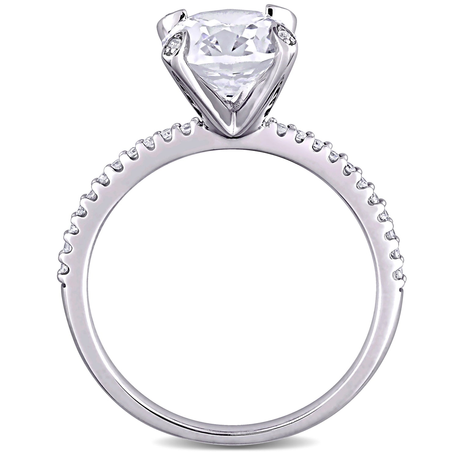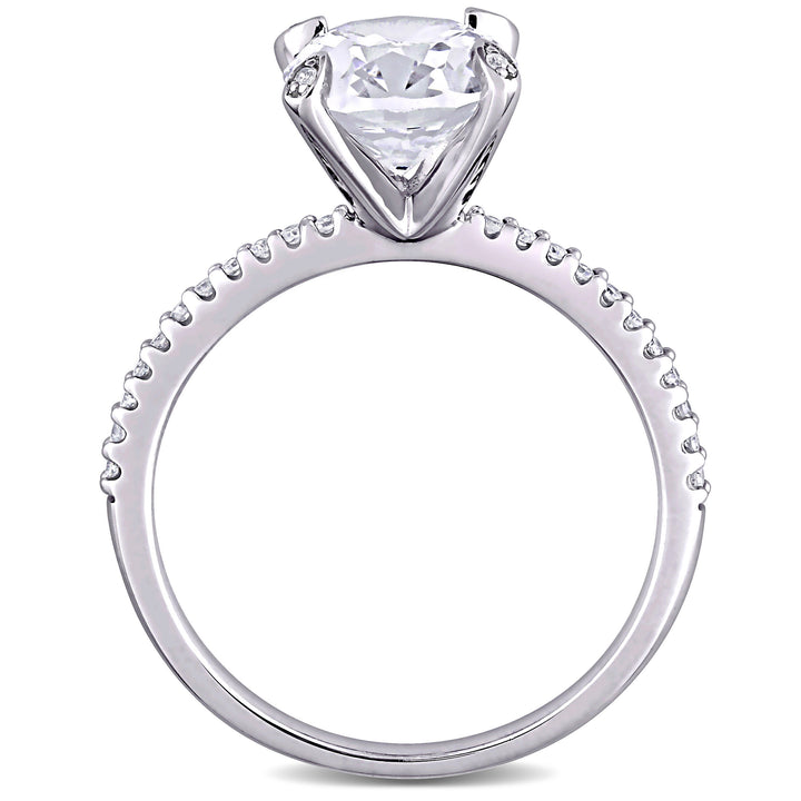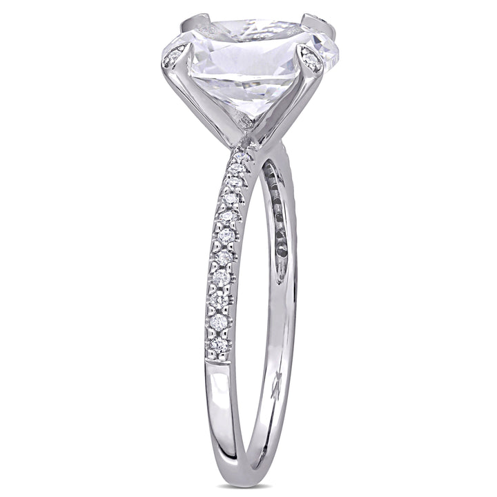Crafted in 10K white gold with 4 1/6ct TGW created white sapphire (10x8mm). Features 4 round-cut diamonds (G-H, I2-I3) on the prongs and 22 round-cut diamonds (G-H, I2-I3) along the band.