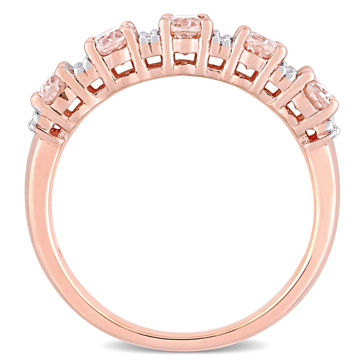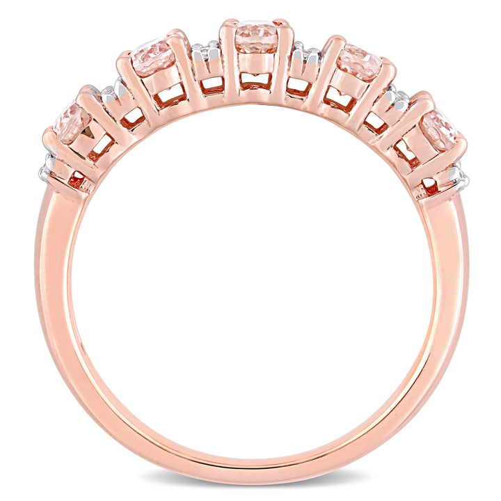 Handcrafted in 14k rose gold with five oval-cut prong-set morganite gemstones (5x3mm) and 18 round-cut prong-set diamonds (G-H color, I1 clarity).