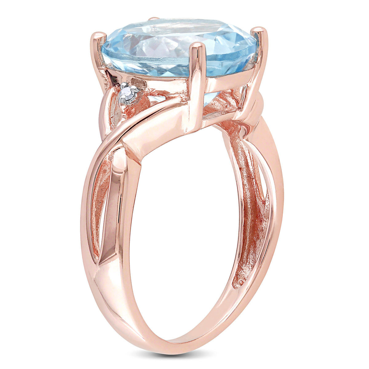 Crafted in rose gold flash-plated sterling silver with a 12x10mm oval-cut sky blue topaz and two round-cut diamonds (H-I color, I3 clarity).