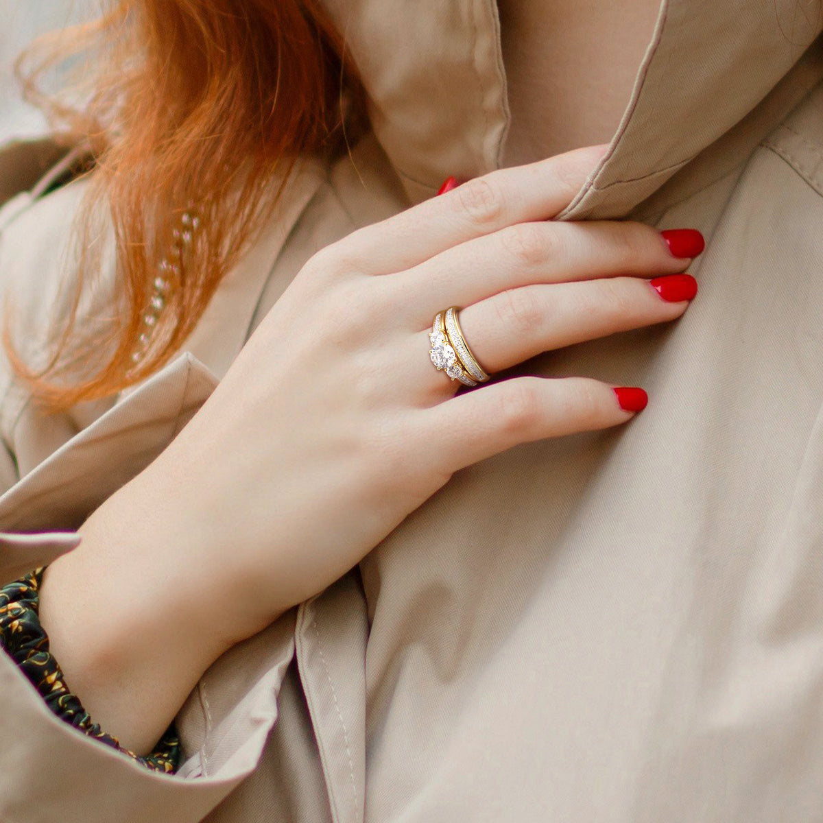 This Cubic Zirconia Three-Stone Bridal Ring Set by Mimi & Max celebrates the past, present, and future with sparkling brilliance. The trio of stones is beautifully set in yellow-plated sterling silver for a radiant and modern bridal statement.