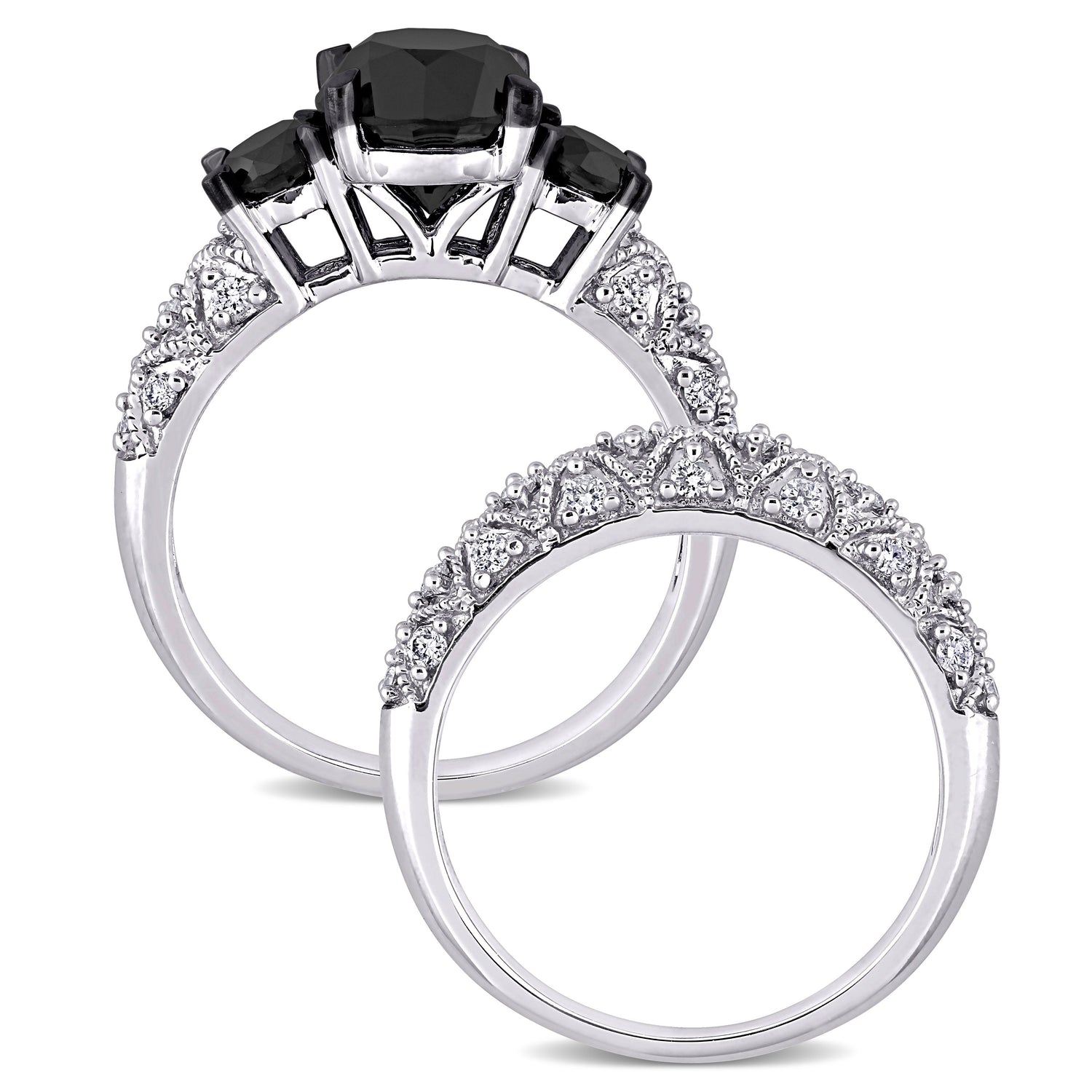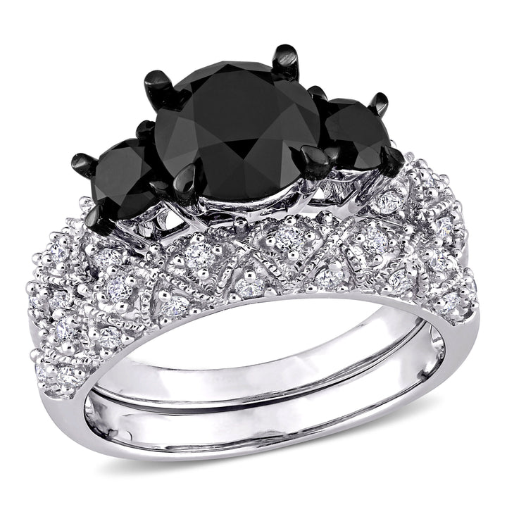 3ct TW Black and White Diamond 3-Stone Vintage Bridal Set in 10k White Gold
