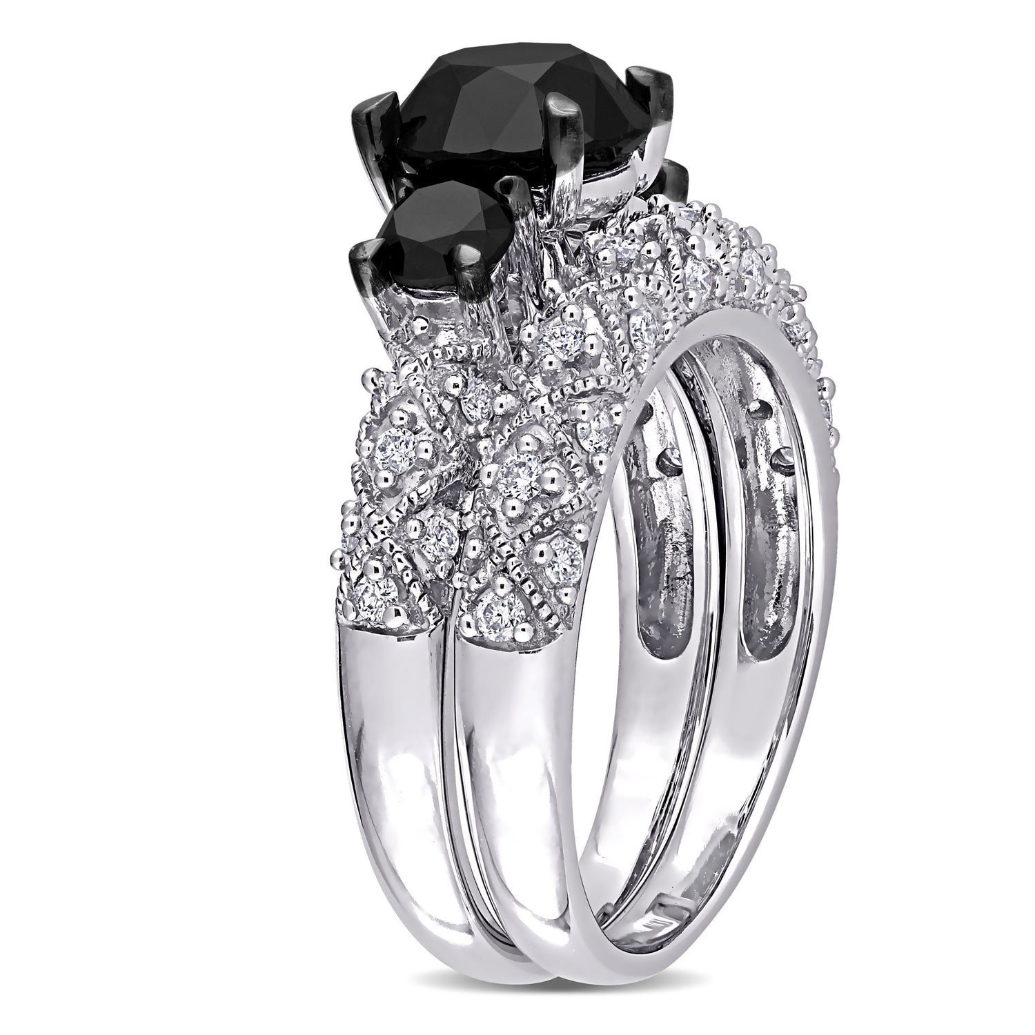 Crafted in 10K white gold with 3ct total weight in diamonds. The engagement ring features a round-cut black diamond and 23 round-cut white diamonds (G-H, I2-I3). The wedding band has 12 round-cut white diamonds.