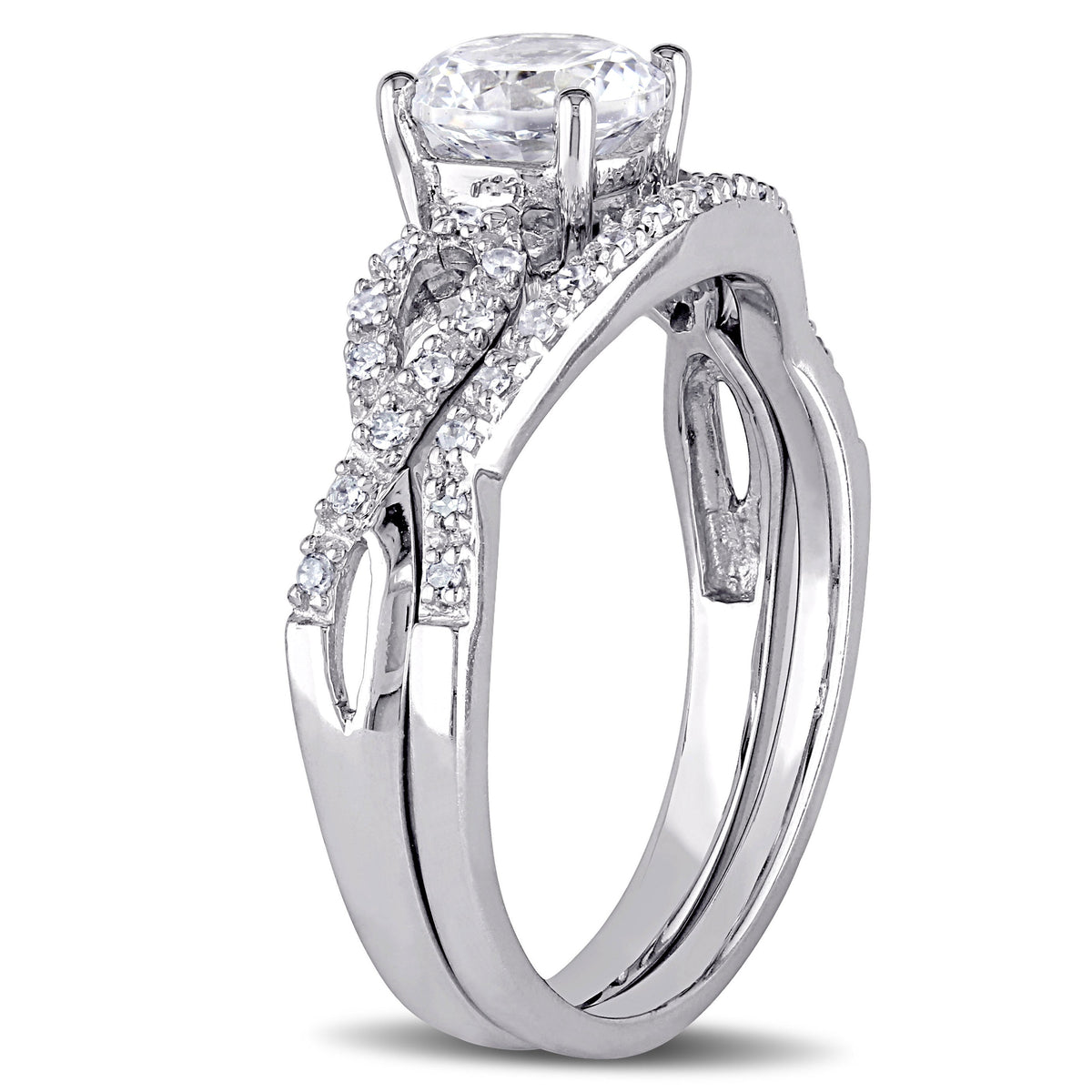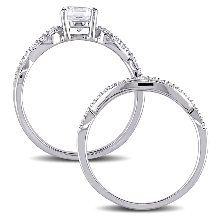 Handcrafted in 10k white gold, this bridal set features a 1-carat round-cut created white sapphire, 20 round-cut diamonds (1/10 carat total weight) set in prong, and 18 round-cut diamonds (0.07 carat total weight) set in prong. The ring setting measures 20 mm wide x 7.5 mm long x 5.25 mm high, with a 3.75 mm wide band.