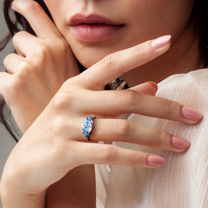This Cushion Cut Sky and London Blue Topaz and Diamond Accent Ring by Mimi & Max adds a vibrant burst of color and sophistication. Set in luminous sterling silver, the central cushion-cut sky blue topaz is flanked by heart-cut London blue topaz stones and accented with shimmering diamonds. Perfect for cocktail parties or statement occasions, this ring embodies bold elegance.
