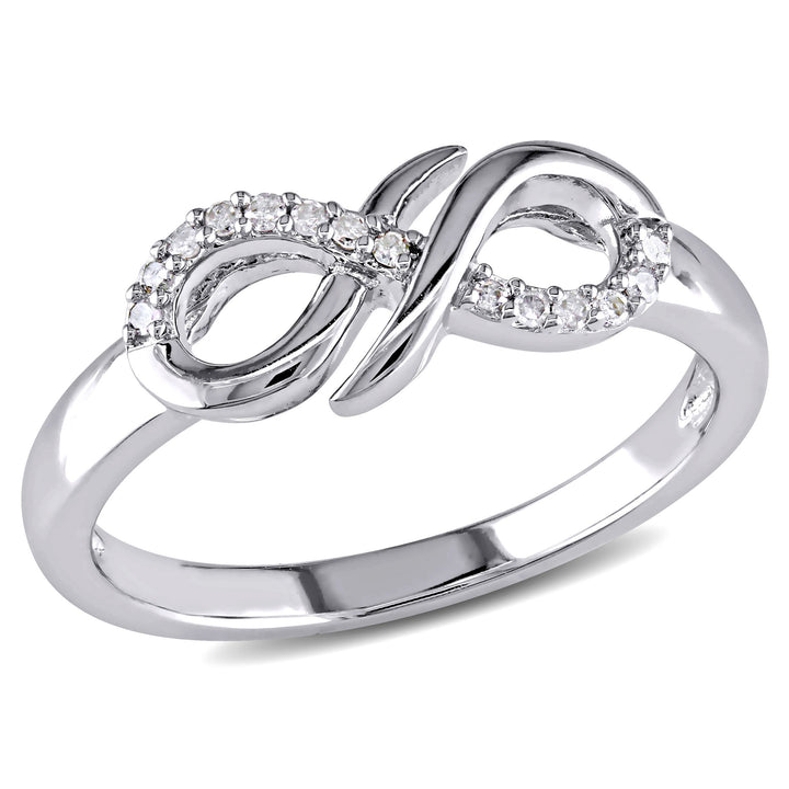 This Diamond Infinity Ring by Mimi & Max is a graceful symbol of eternity, adorned with sparkling round diamonds in polished sterling silver. It's timeless design makes it perfect for everyday elegance or as a meaningful gift.