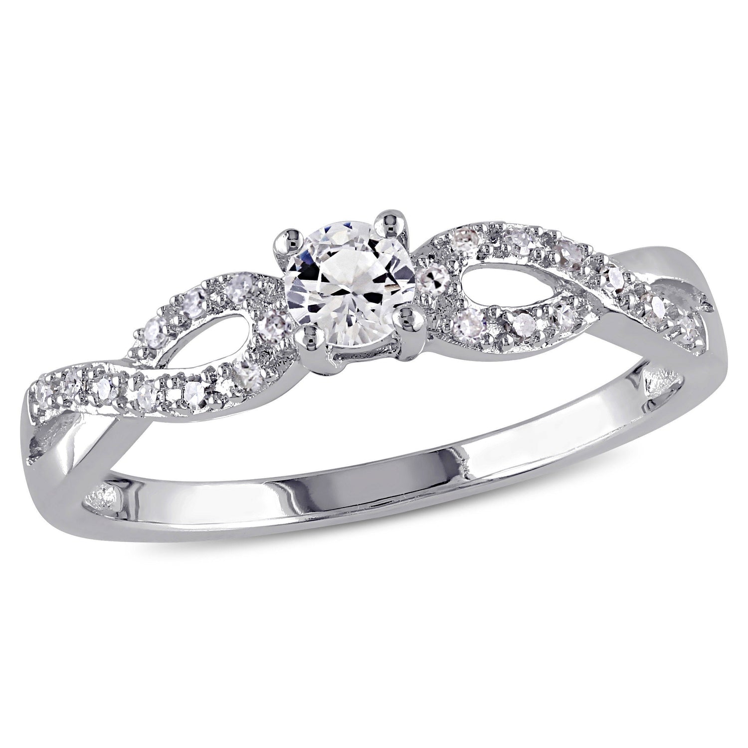 This 1/10ct TW Diamond and Created White Sapphire Infinity Ring by Mimi & Max blends classic promise-ring symbolism with shimmering diamonds and a delicate crossover infinity design — perfect for celebrating lasting love.
