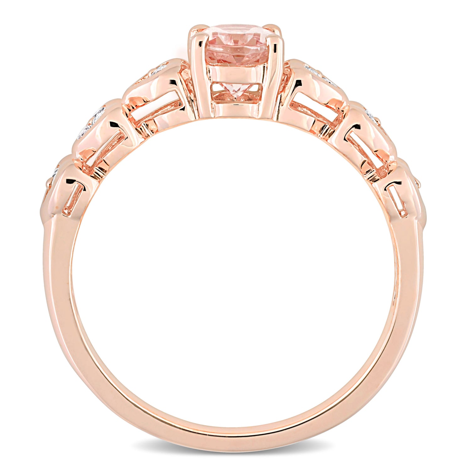 Set in rose rhodium-plated sterling silver with an oval-cut prong-set morganite (7x5mm) and 18 round-cut prong-set white topaz gemstones.
