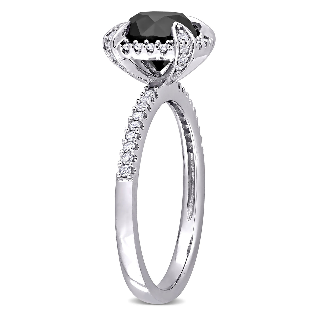 Crafted in 10k white gold with a round-cut prong-set black diamond centerpiece, surrounded by 50 pave and buttercup-set white diamonds (G-H color, I2-I3 clarity).