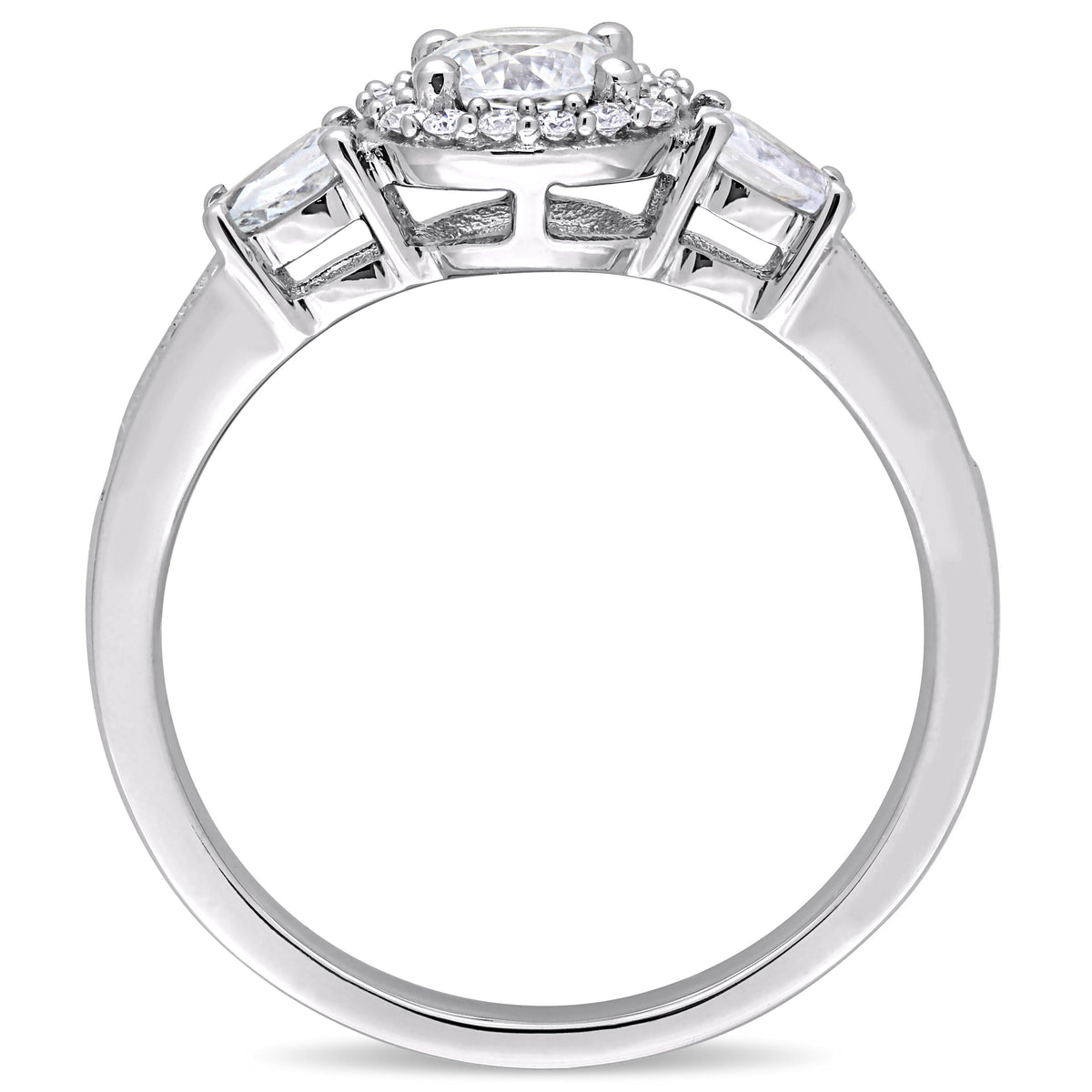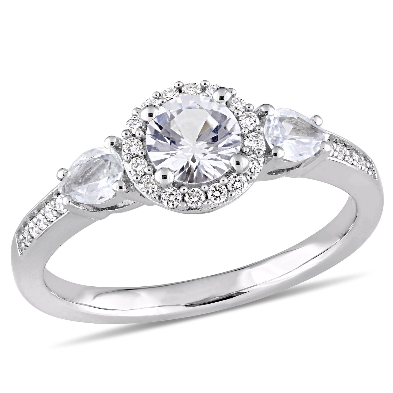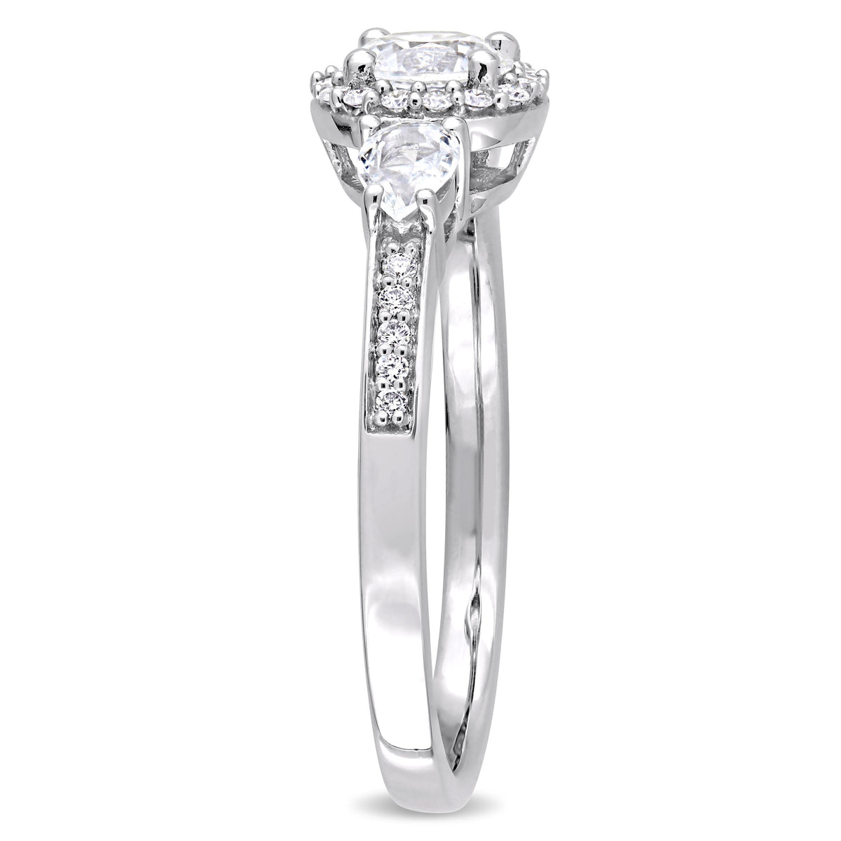 1ct TW Round and Pear-Cut White Sapphire and 1/8 ct TW Diamond 3-Stone Halo Ring in 14k White Gold