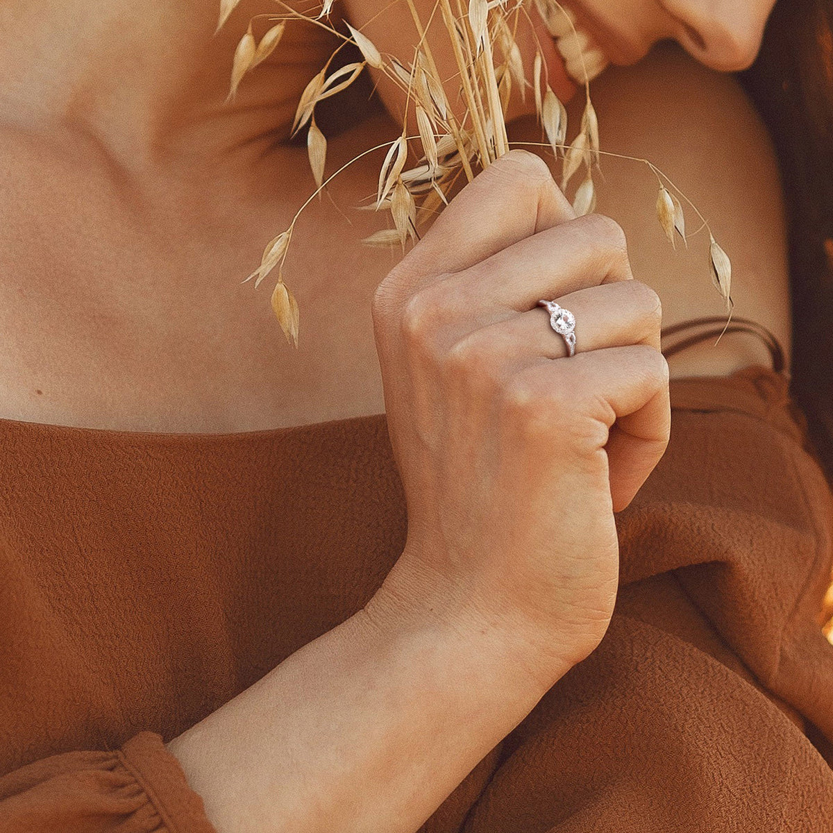 Crafted in 14k white gold with a 1ct total weight round white sapphire (5x5mm), pear-cut white sapphires, and 0.125 ct. t.w. round diamonds (G-H color, I1-I2 clarity).