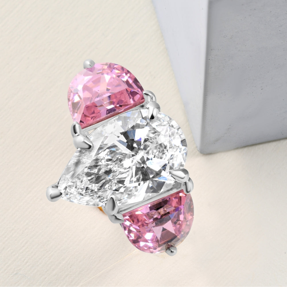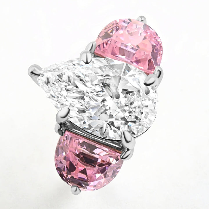 Crafted in 14K white gold, featuring a 6ct certified lab-grown pear-shaped diamond and pink half-moon gemstones.