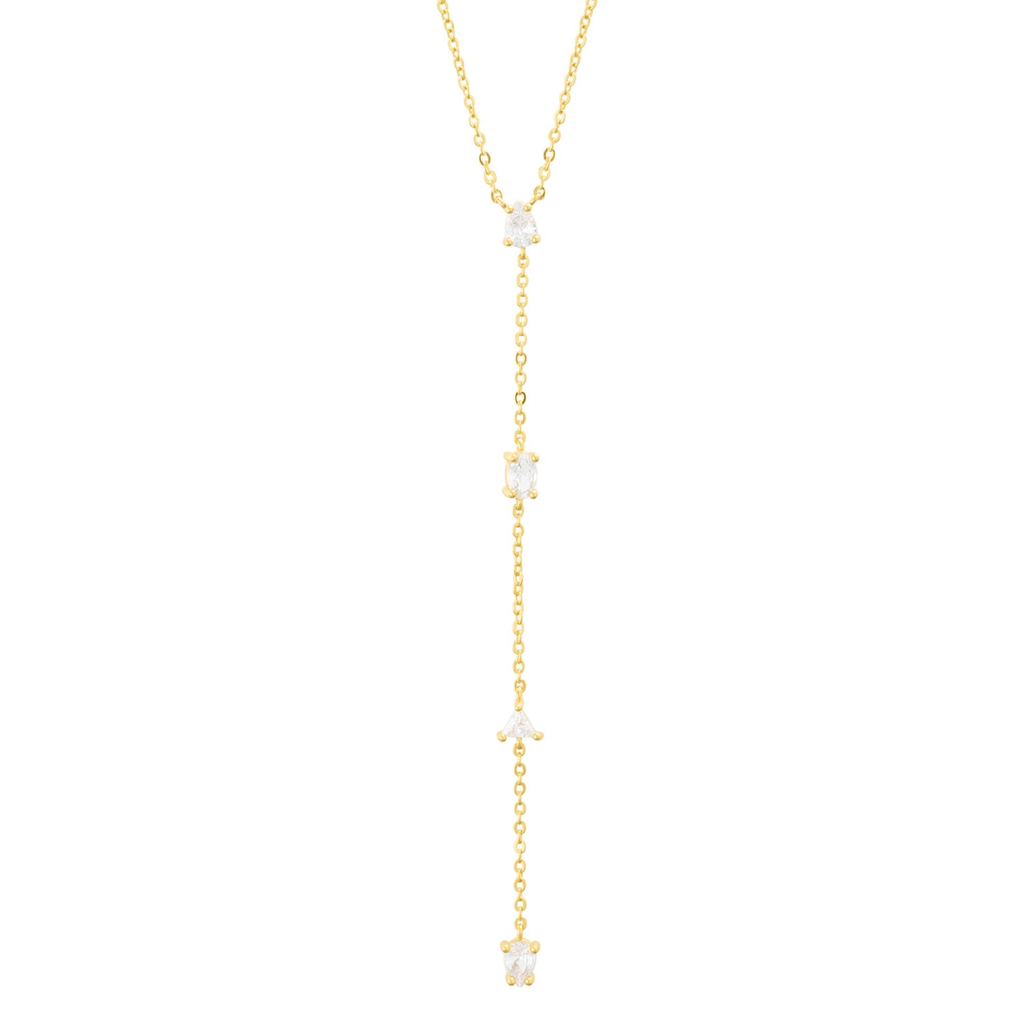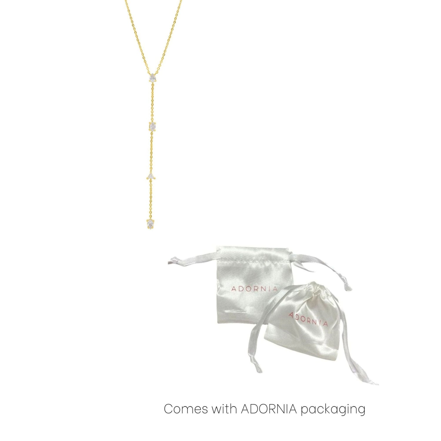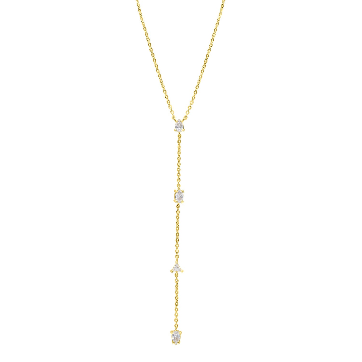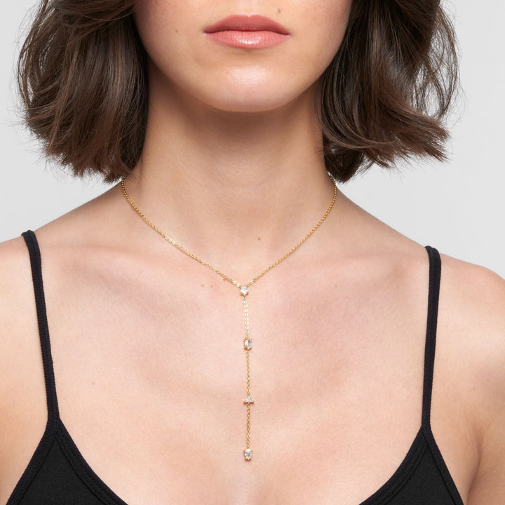 Crafted in 14k yellow gold-plated brass with crystals. Adjustable length from 16–18 inches with a 4-inch drop chain. Lobster clasp.
