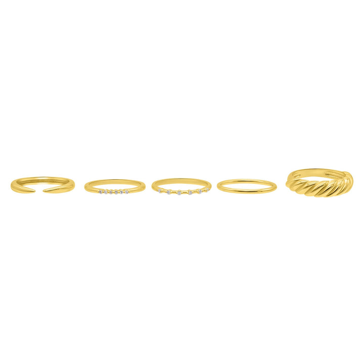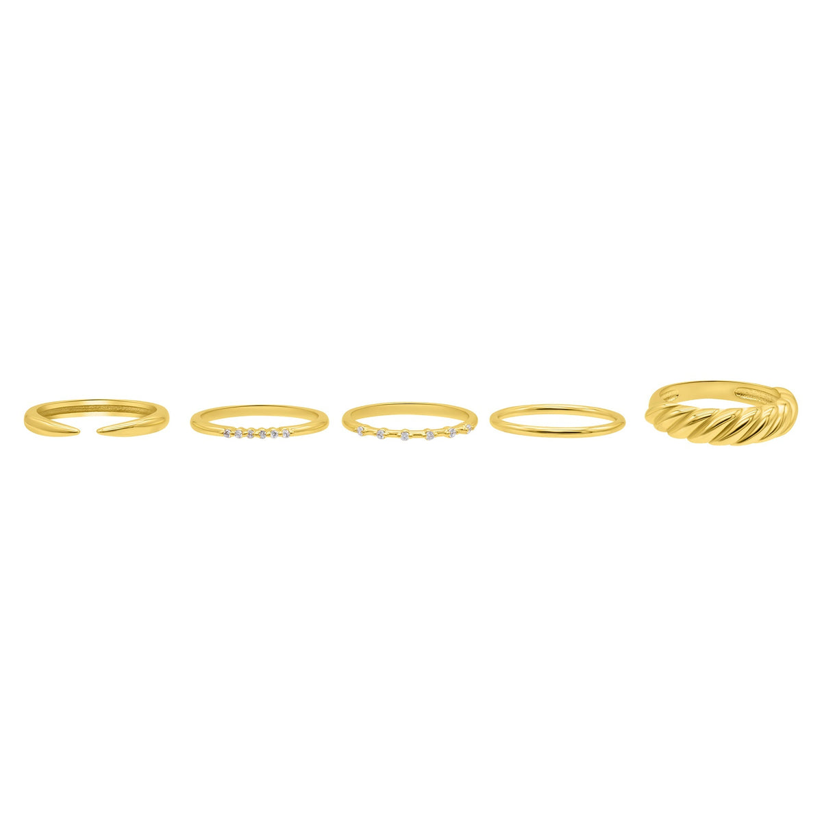 14K yellow gold plated brass with cubic zirconia, set of 5 stacking bands (1-3mm width).