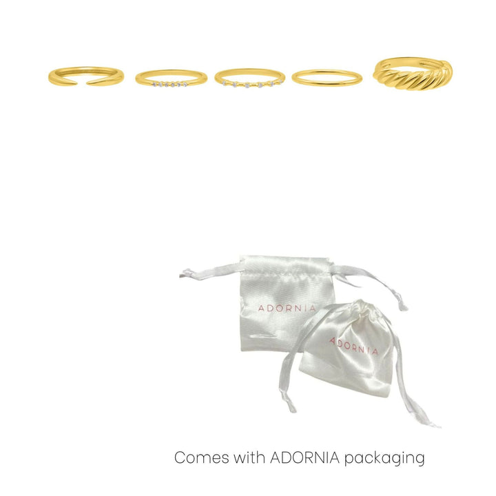 The 14k Gold Plated Set of 5 Stacking Bands by Adornia is a luxurious and versatile set, designed for everyday wear. These bands can be worn individually or stacked for a bold, customized look. Crafted in 14K yellow gold plated brass, each band is encrusted with cubic zirconia for added sparkle.