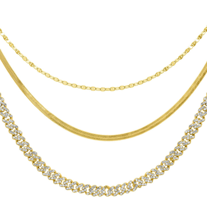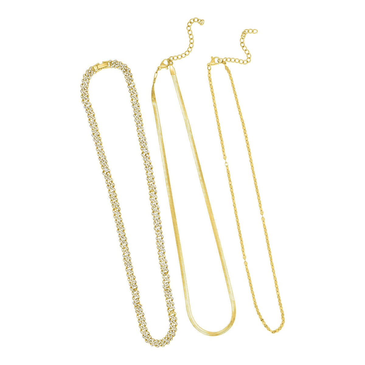 This Adjustable Valentina, Herringbone, and Crystal Curb Chain Necklace Set by Adornia offers luxury layering made easy. Featuring three distinct chains, this set brings together texture, sparkle, and classic gold finishes for everyday glamour.