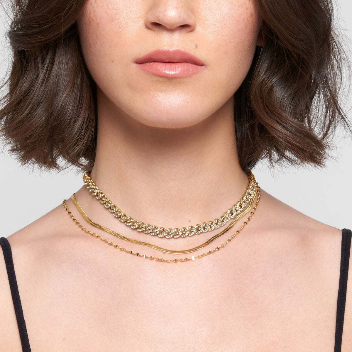 Set in 14k gold-plated brass with crystals. Chain lengths: 16.5' (8mm width), 16-18' adjustable (3mm width), and 16-18' adjustable (2mm width). Lobster clasp closures.