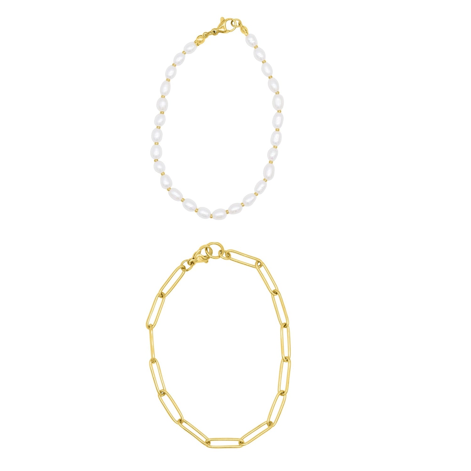 Tarnish Resistant 14k Gold Plated Freshwater Pearl and Paperclip Chain Bracelet Set