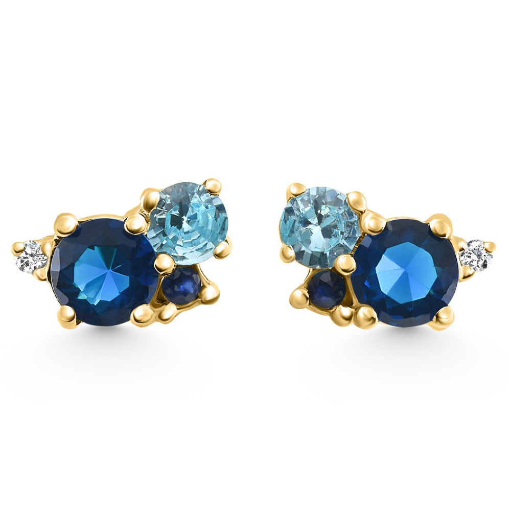 Featuring two round-cut diamonds and six round-cut gemstones (blue topaz, blue sapphire, and aquamarine), totaling 4 carats. Set in solid 14K gold with 14K screw-back closures. Diamond clarity is VS, and the diamond color is F-G.