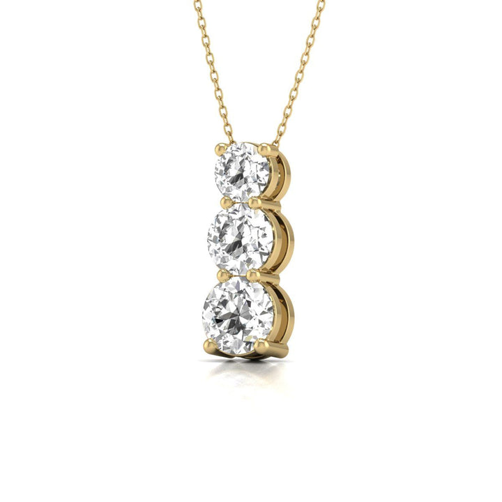 The 14KT Yellow Gold 2ct TW Three Stone Snow Hidden Bail Pendant by Diana M radiates brilliance with three stunning lab grown diamonds suspended by an elegant hidden bail for seamless beauty.
