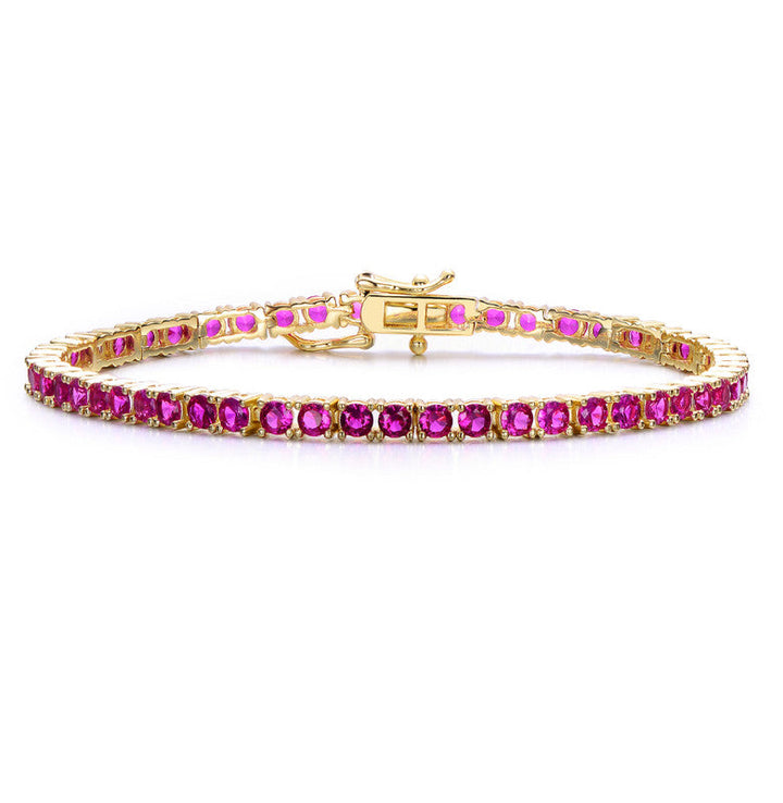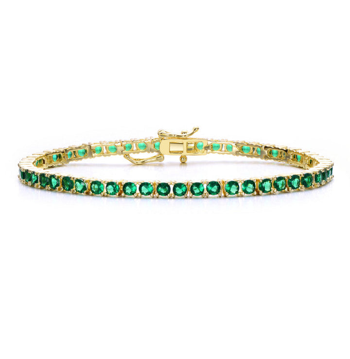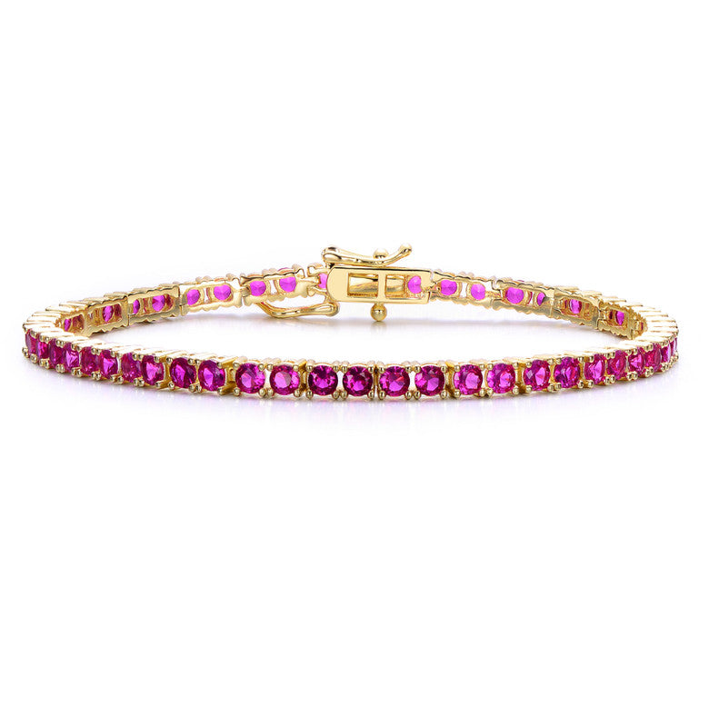 Crafted in 14k gold-plated material with colored 3mm cubic zirconia stones and a secure box clasp. Measures 7.25 inches in length.