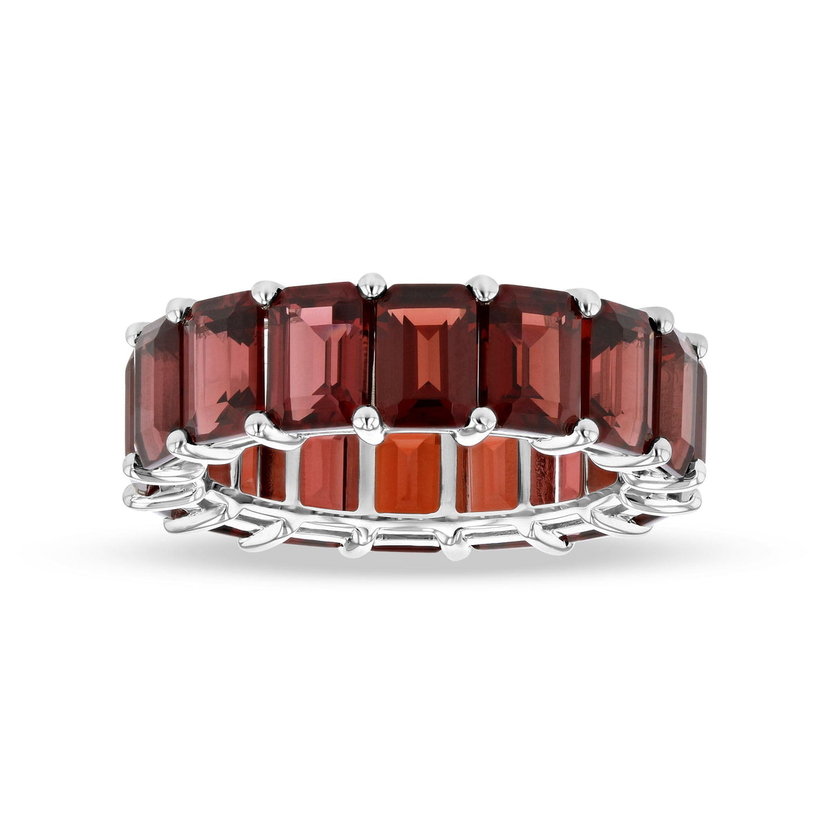 This 12.23ctw Garnet Emerald Cut Eternity Band by Diana M Jewels makes a bold, colorful statement. Featuring dazzling emerald-cut garnets encircling the band in luminous 14k white gold, it’s perfect for adding vibrant elegance.
