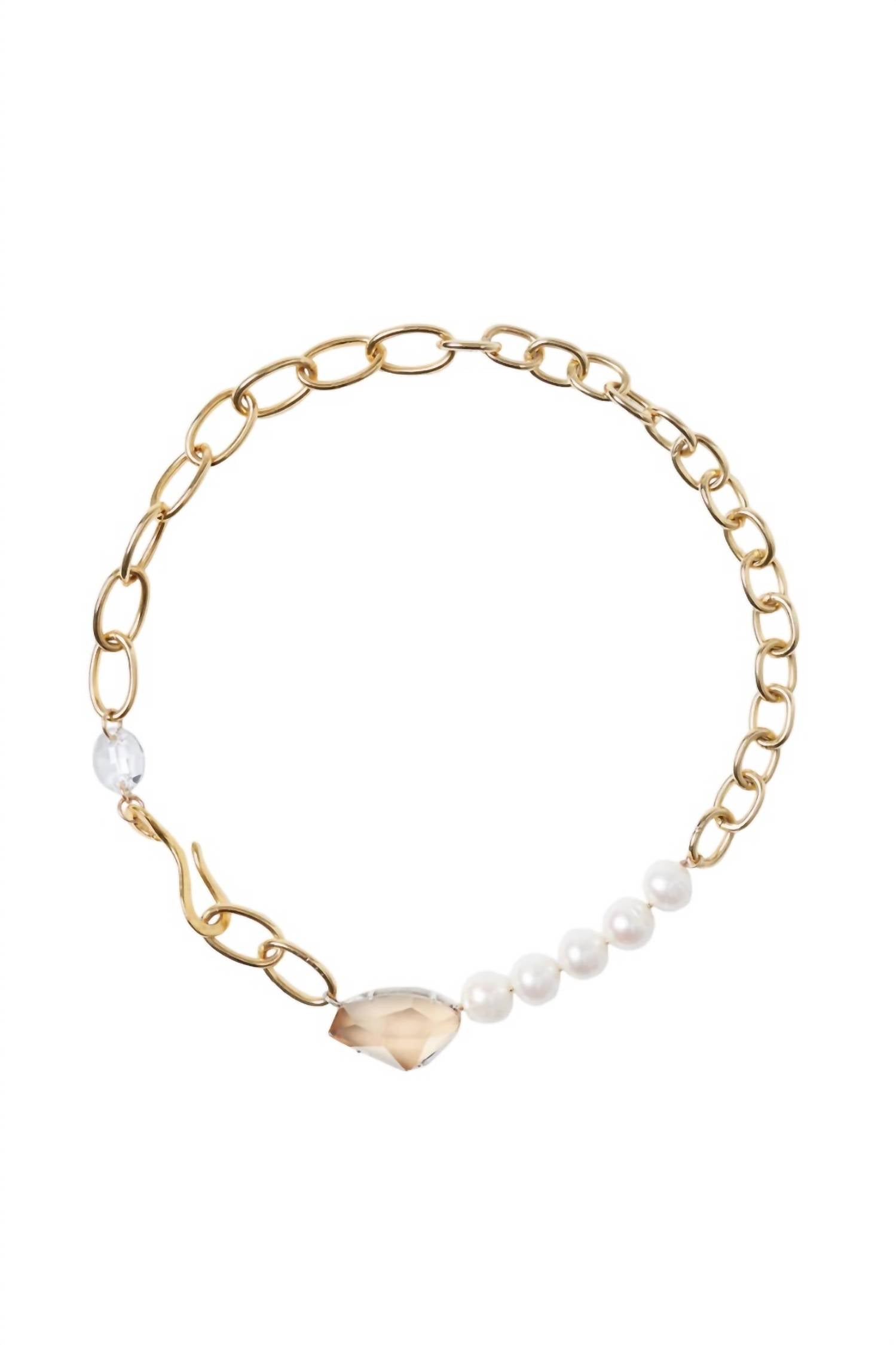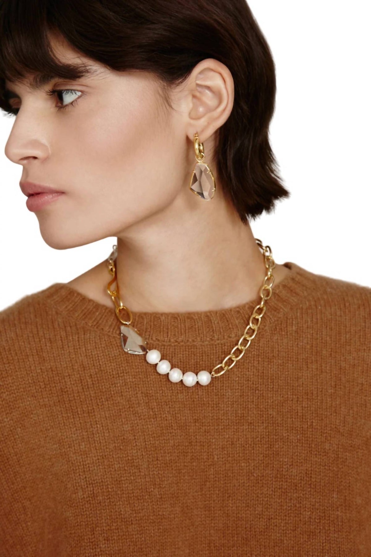 Gold-plated base metal with a freshwater pearl and crystal accents. 17-inch length. Handmade in Vietnam.