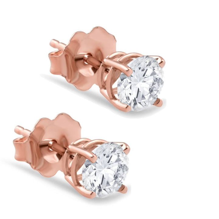 1ct total diamond weight, round brilliant cut natural diamonds, prong set in 14k rose gold with push back findings.