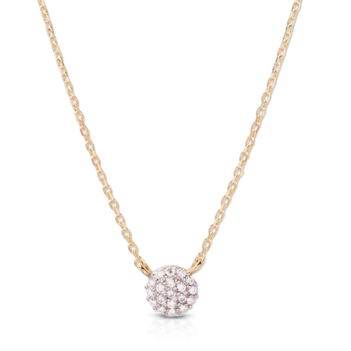 Crafted in 14K yellow gold with 1mm round lab-grown diamonds (F-G color, VS clarity) in a pave setting. Pendant measures 4mm, with a 16-inch cable chain and 2-inch extender.