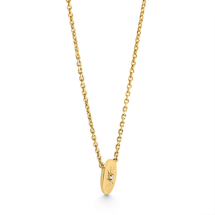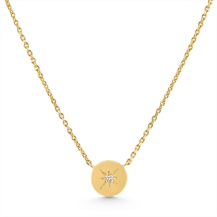 This Diamond Disc Starburst Pendant by Pompeii3 is a delicate, radiant piece symbolizing light and guidance. A single brilliant cut natural diamond rests in the center of a bright polished 7.5mm 14k yellow gold disc. Suspended on an 18' chain for effortless elegance.