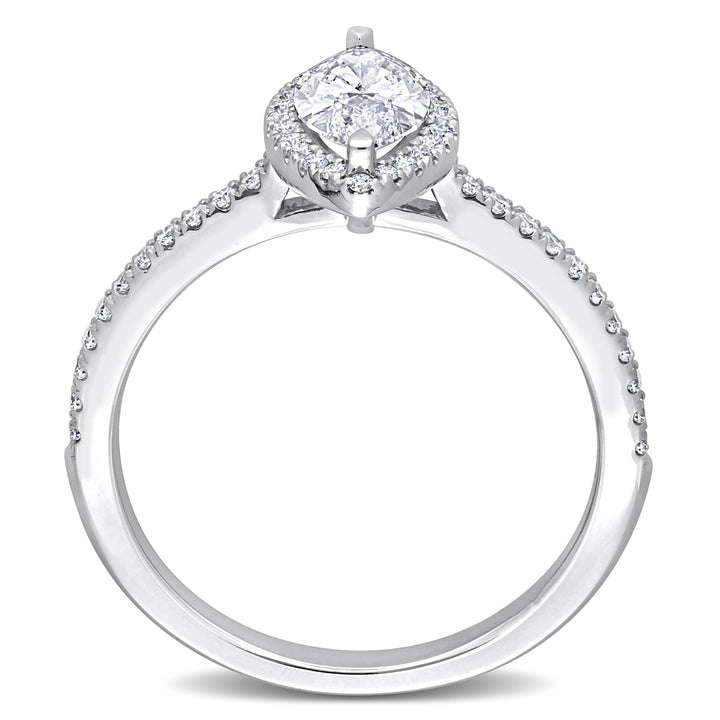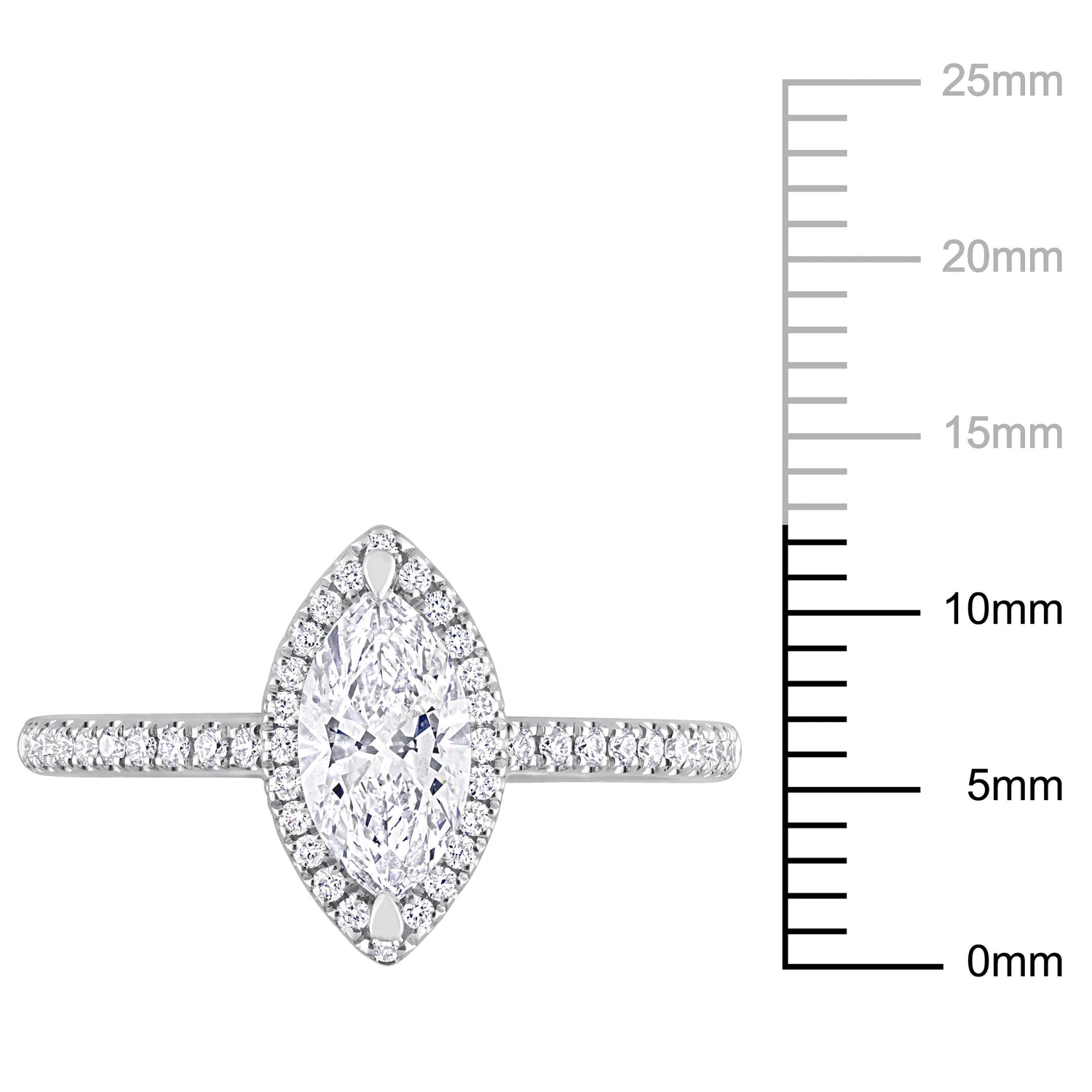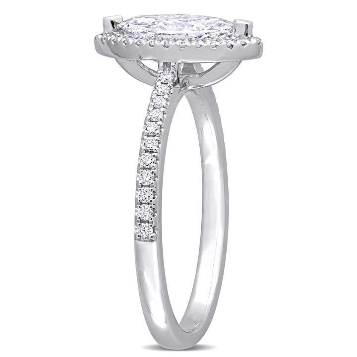 Crafted in 14k white gold featuring a center marquise-cut lab-grown diamond surrounded by a halo of round-cut diamonds, totaling 1 1/2ct total weight.