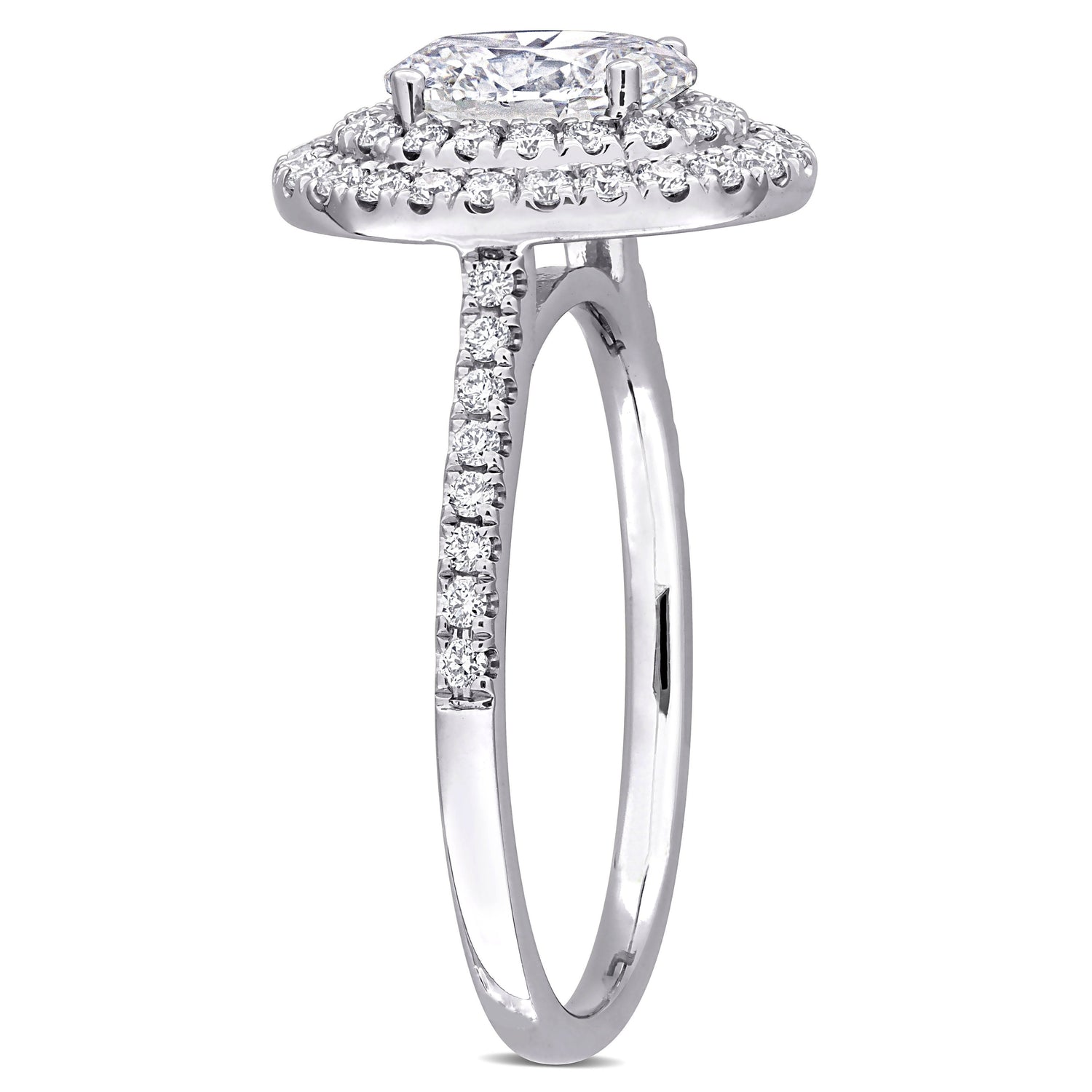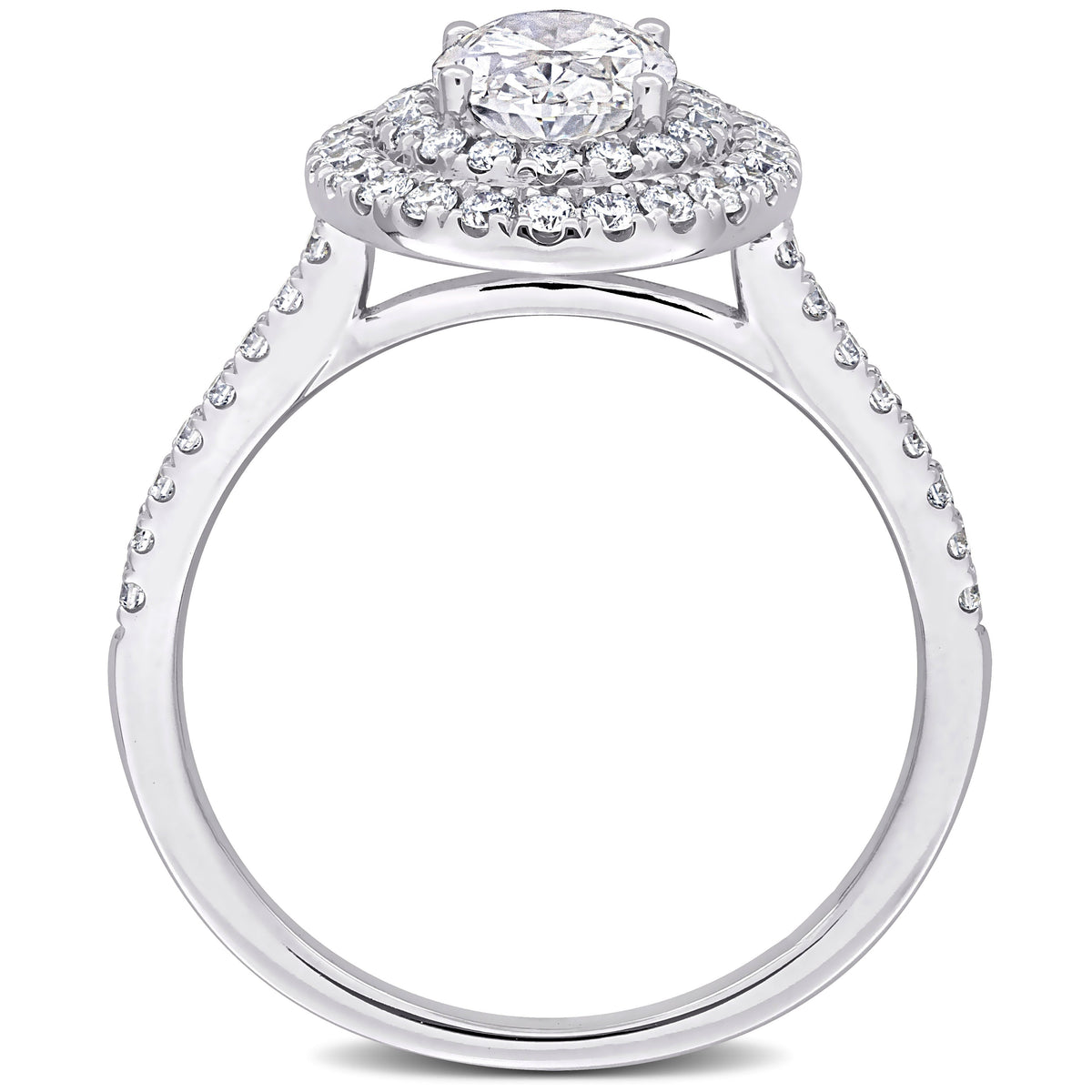 Expertly crafted in 14k white gold featuring a 1 1/2 carat total weight oval lab-grown diamond, surrounded by a double halo of smaller lab-grown diamonds.