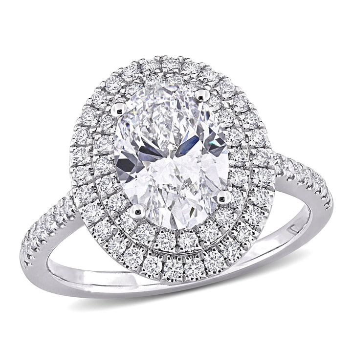2 1/2ct TW oval and round-cut lab-grown diamonds, 14k white gold, double halo setting.