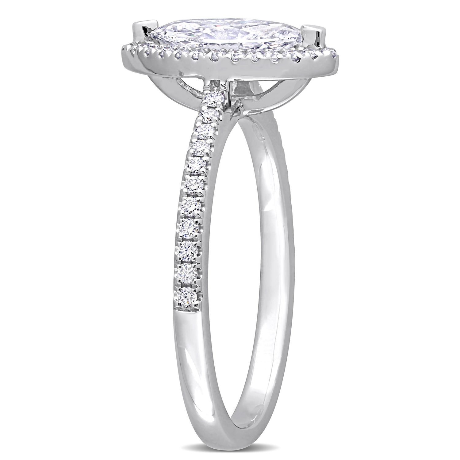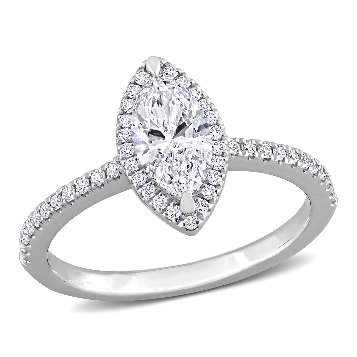 Handcrafted in 14k white gold featuring a 1 1/2 total carat weight (TW) lab-grown diamond center stone in marquise-cut, accented by round-cut diamond halo detailing.